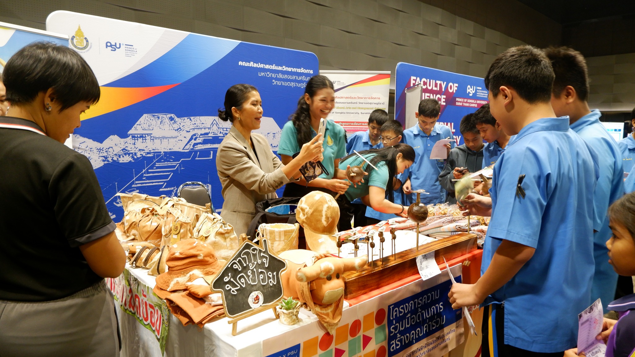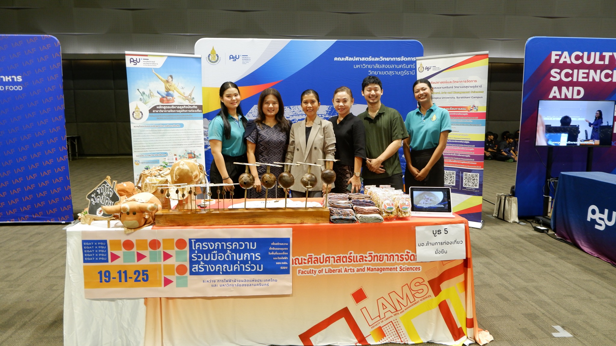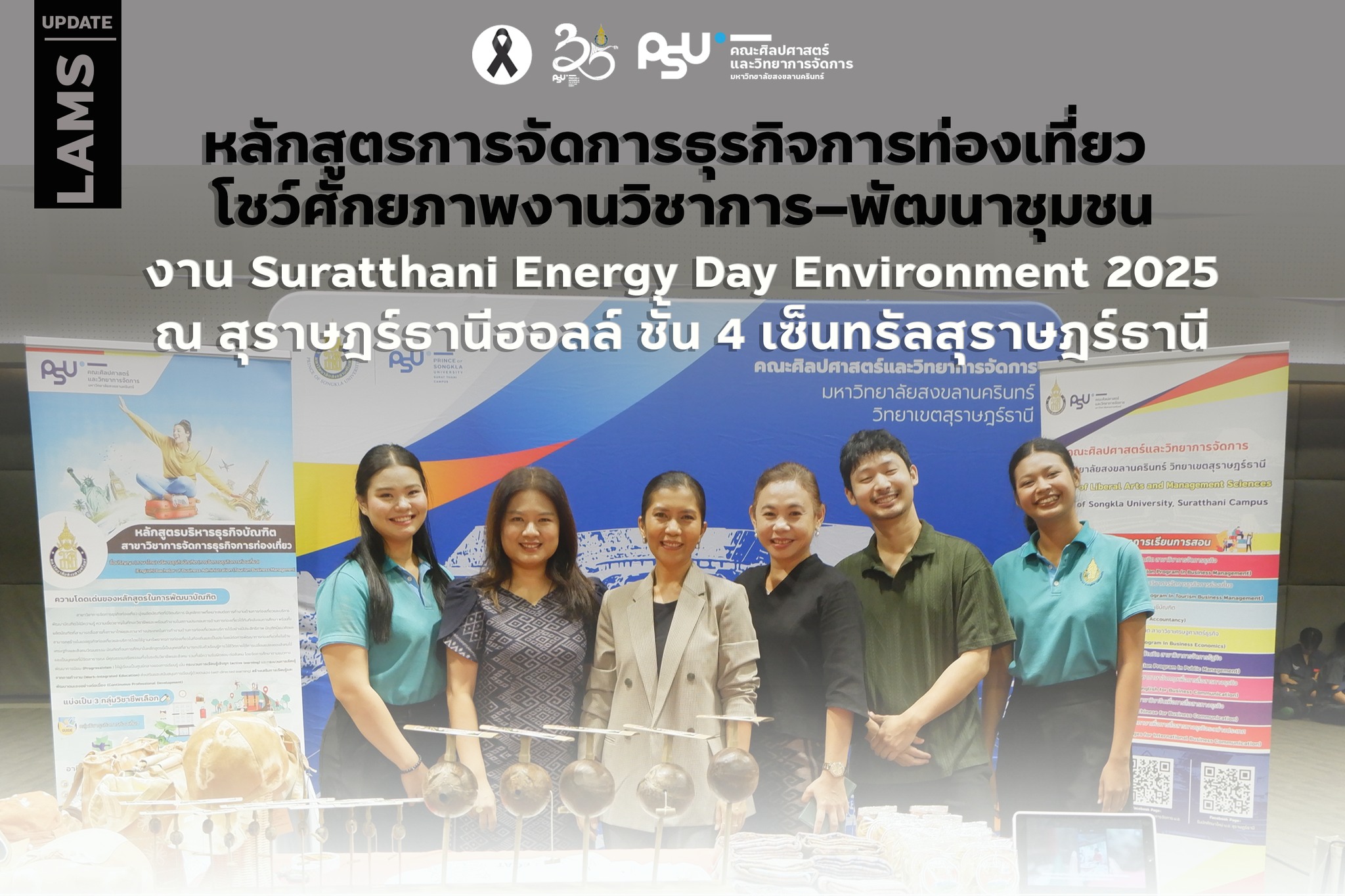 หลักสูตรการจัดการธุรกิจการท่องเที่ยว คณะศิลปศาสตร์และวิทยาการจัดการ โชว์ศักยภาพงานวิชาการ–พัฒนาชุมชน งาน Suratthani Energy Day Environment 2025 ณ สุราษฎร์ธานีฮอลล์ ชั้น 4 เซ็นทรัลสุราษฎร์ธานี วันพุธที่ 19 พฤศจิกายน 2568 คณาจารย์และนักศึกษาหลักสูตรฯ คณะศิลปศาสตร์และวิทยาการจัดการ ม.อ. สุราษฎร์ธานี ร่วมจัดบูธและนำเสนอผลงานบริการวิชาการ ดังนี้ พัฒนาการท่องเที่ยวรอบเขื่อนรัชชประภา (CSV: กฟผ.–ม.อ.) โดย ดร.วิชชุตา มาชู (หัวหน้าคณะทำงาน) และทีม ดร.ภัทราพร วรินทรเวช พร้อมนักศึกษาปี 4 (สหกิจศึกษา) พัฒนาบริษัทจัดการแหล่งท่องเที่ยว (Destination Management Company: DMC) และนำเสนอผลิตภัณฑ์ชุมชน โดยเฉพาะ “ลูกหวือตาราน” ของเล่นพื้นบ้านที่ได้รับความสนใจอย่างมาก สะท้อนการบูรณาการเรียน–รับใช้สังคมอย่างมีประสิทธิภาพ โครงการยุวชนอาสา 2568 โดย อาจารย์ปทิดา โมราศิลป์ หัวหน้าคณะทำงานโครงการยุวชนอาสา ได้นำผลิตภัณฑ์ ผ้ามัดย้อมจากวิสาหกิจชุมชน “จากใจมัดย้อม” โรงเรียนวัดประสิทธาราม จัดแสดงและจำหน่าย เสริมรายได้ให้ชุมชน ในโอกาสนี้ นายจุมพฏ วรรณฉัตรสิริ ผู้ว่าราชการจังหวัดสุราษฎร์ธานี ได้เยี่ยมชมบูธนิทรรศการหลักสูตรการจัดการธุรกิจการท่องเที่ยว และชื่นชมต่อบทบาทสำคัญในการร่วมพัฒนาชุมชนและสนับสนุนการท่องเที่ยวของจังหวัด ทั้งนี้จังหวัดพร้อมให้การสนับสนุนภารกิจของหลักสูตรอย่างต่อเนื่อง การเข้าร่วมงานนี้ แสดงให้เห็นถึงบทบาทของคณะในด้านการพัฒนาสังคม ชุมชน และการสร้างประสบการณ์จริงให้นักศึกษา เพื่อต่อยอดสู่การทำงานในอนาคตอย่างยั่งยืน