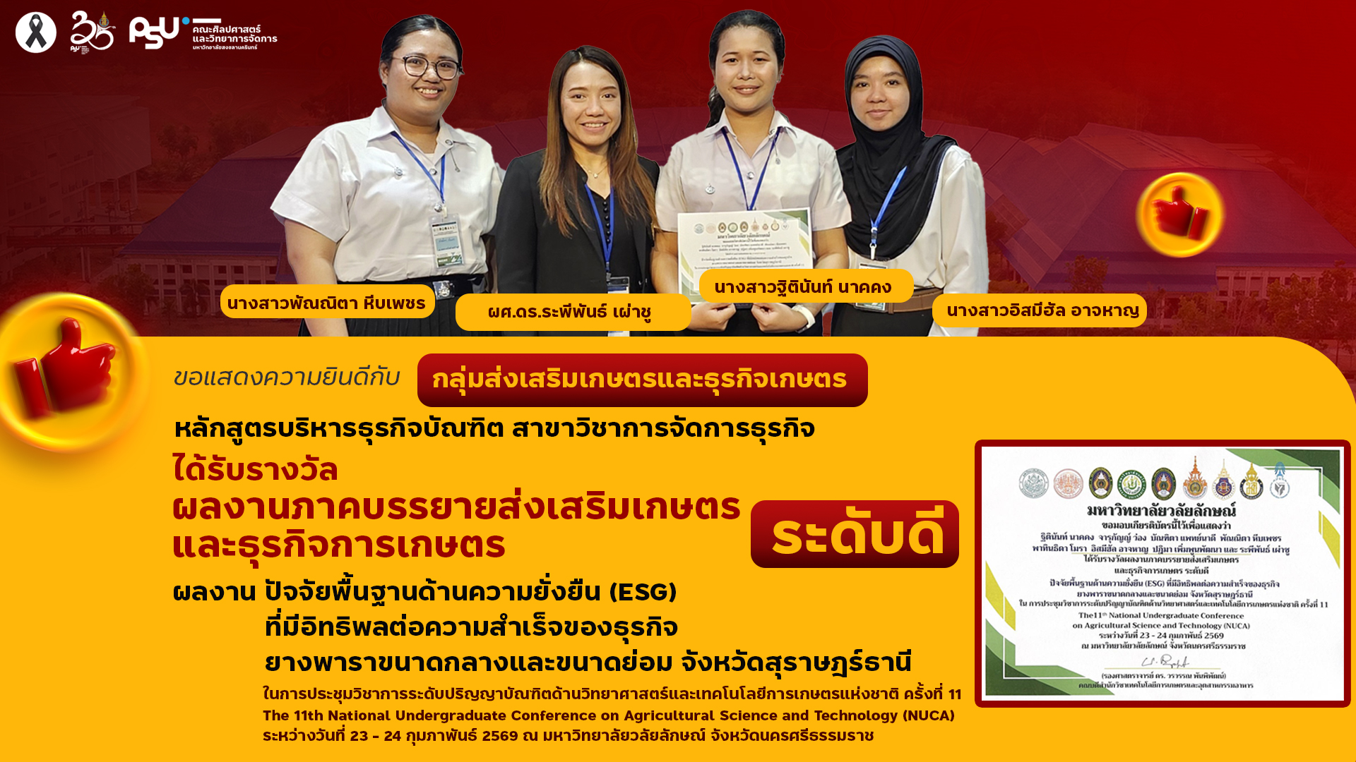 คณะศิลปศาสตร์และวิทยาการจัดการ มหาวิทยาลัยสงขลานครินทร์ วิทยาเขตสุราษฎร์ธานี ขอแสดงความยินดีกับ กลุ่มส่งเสริมเกษตรและธุรกิจเกษตร หลักสูตรบริหารธุรกิจบัณฑิต สาขาวิชาการจัดการธุรกิจ ที่ได้รับรางวัล ผลงานภาคบรรยายส่งเสริมเกษตรและธุรกิจการเกษตร ระดับดี