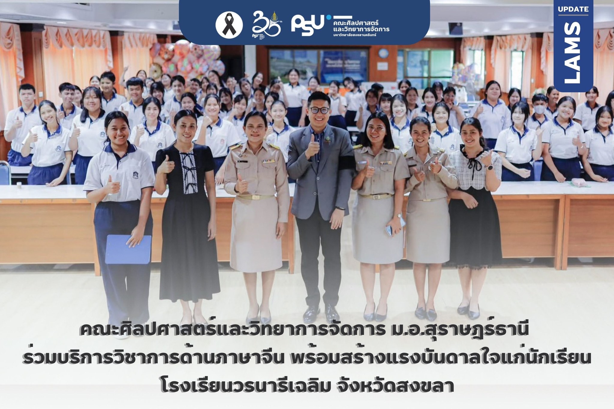 คณะศิลปศาสตร์และวิทยาการจัดการ มหาวิทยาลัยสงขลานครินทร์ วิทยาเขตสุราษฎร์ธานี โดยผู้ช่วยศาสตราจารย์ ดร.พิชัย แก้วบุตร รองคณบดีฝ่ายสื่อสารองค์กรและวิเทศสัมพันธ์ ร่วมโครงการบริการวิชาการด้านภาษาจีนและการสร้างแรงบันดาลใจให้กับผู้เรียน ณ โรงเรียนวรนารีเฉลิม จังหวัดสงขลา เพื่อเสริมสร้างทักษะภาษาจีนให้กับนักเรียน พร้อมทั้งจุดประกายแรงบันดาลใจในการเรียนรู้และต่อยอดสู่การศึกษาในระดับที่สูงขึ้น ซึ่งได้รับความร่วมมือจากคณะครูและนักเรียนเป็นอย่างดี นับเป็นความร่วมมือทางวิชาการที่ช่วยยกระดับคุณภาพการศึกษาและเสริมสร้างเครือข่ายความร่วมมือระหว่างสถาบันอย่างยั่งยืน