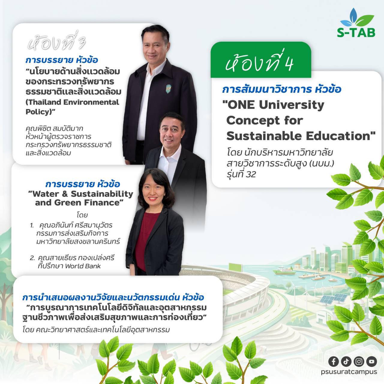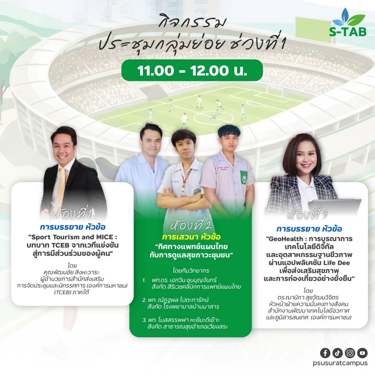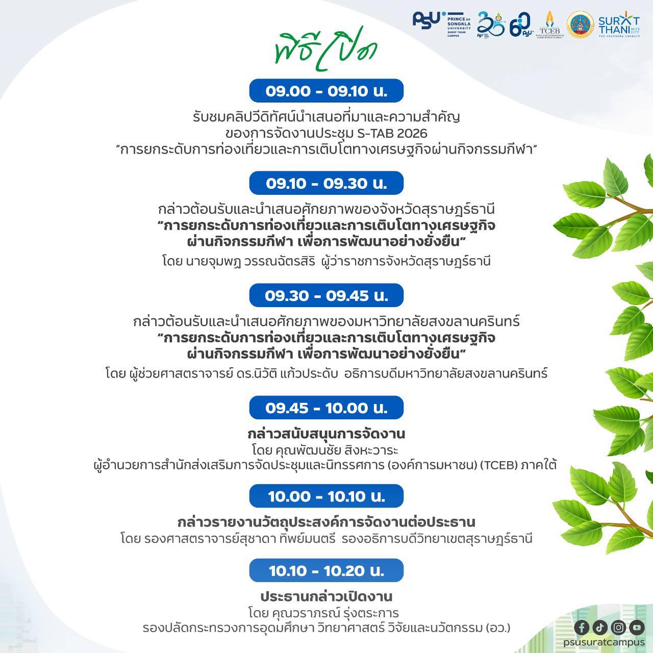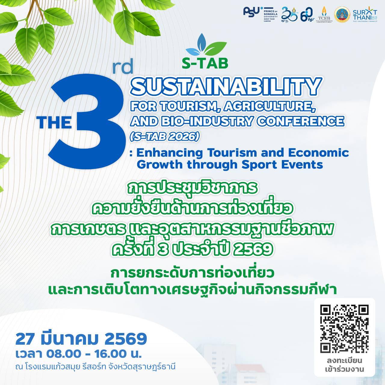 ขอเชิญเข้าร่วมงานประชุมวิชาการความยั่งยืนด้านการท่องเที่ยว การเกษตร และอุตสาหกรรมฐานชีวภาพ ครั้งที่ 3 ประจำปี พ.ศ. 2569 : (The 3rd Sustainability for Tourism, Agriculture, and Bio-industry Conference (S-TAB 2026): Enhancing Tourism and Economic Growth through Sport Events) ระหว่างวันที่ 27 มีนาคม 2569 ณ โรงแรมแก้วสมุย รีสอร์ท อำเภอเมืองฯ จังหวัดสุราษฎร์ธานี ลงทะเบียนเข้าร่วมงานได้ที่ https://scit-datacenter.surat.psu.ac.th/stab/ หรือ Scan QR code ตามภาพ
