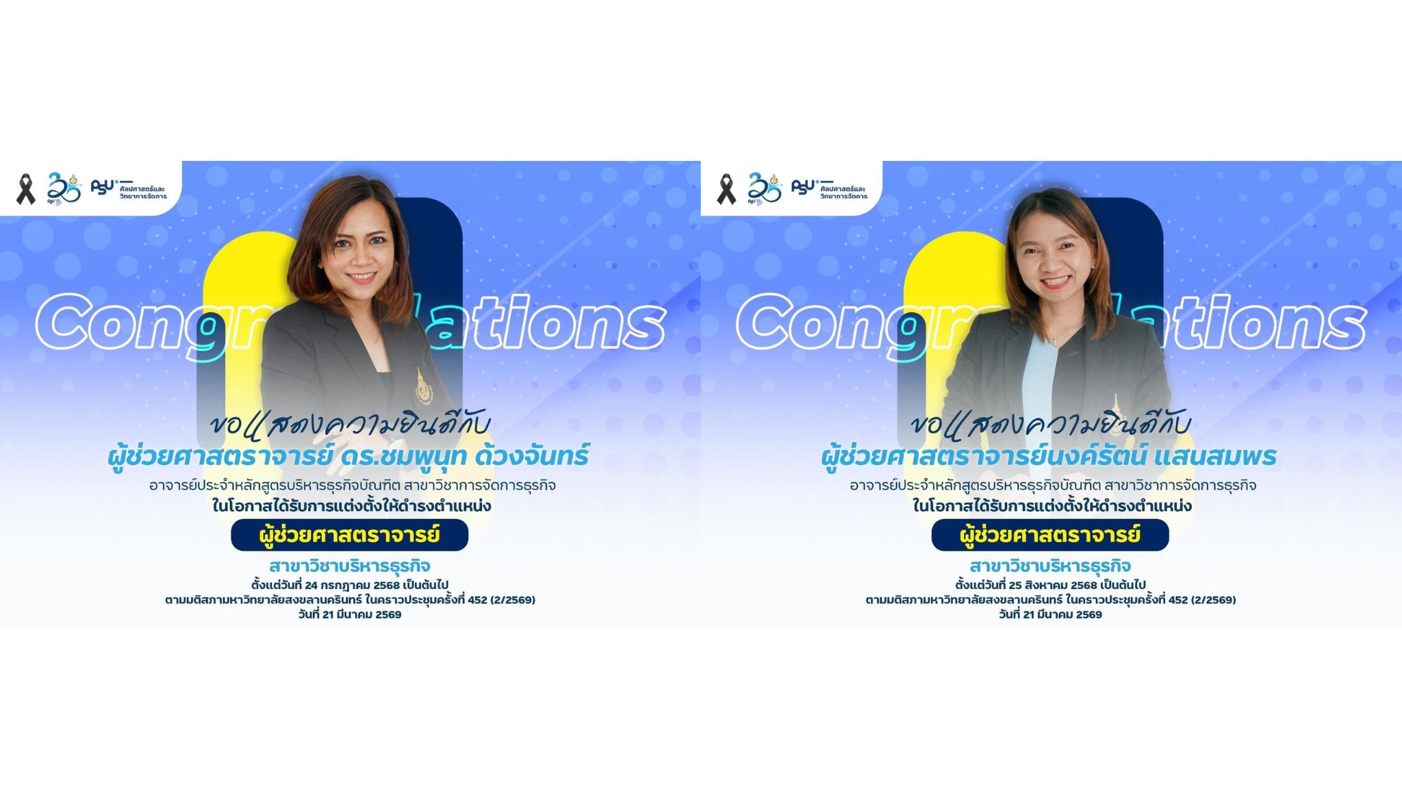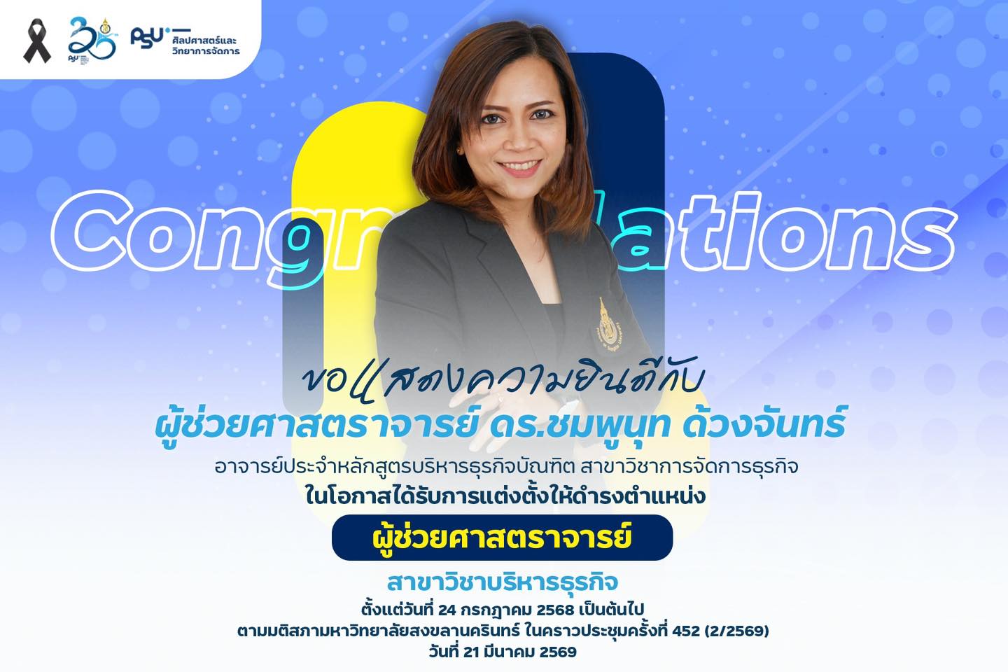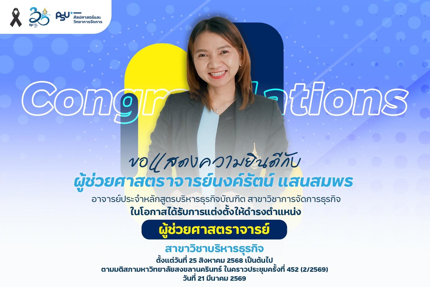 คณะศิลปศาสตร์และวิทยาการจัดการ มหาวิทยาลัยสงขลานครินทร์ วิทยาเขตสุราษฎร์ธานี ขอแสดงความยินดีกับคณาจารย์ในสังกัด ที่ได้รับการแต่งตั้งให้ดำรงตำแหน่งทางวิชาการ “ผู้ช่วยศาสตราจารย์” ในสาขาวิชาบริหารธุรกิจ จำนวน 2 ราย ได้แก่