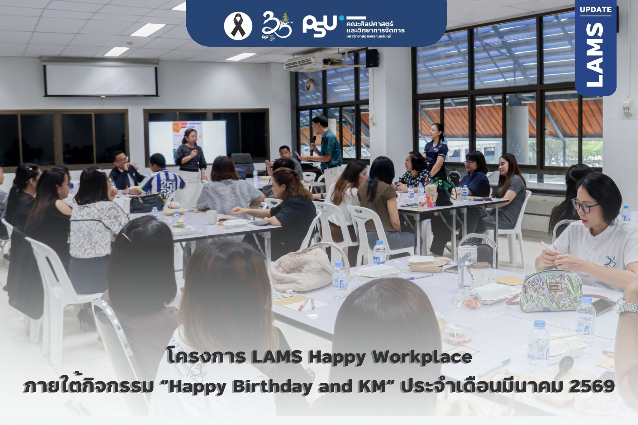 เมื่อวันที่ 20 มีนาคม 2569 คณะศิลปศาสตร์และวิทยาการจัดการ จัดโครงการ LAMS Happy Workplace ประจำปีงบประมาณ 2569 ภายใต้กิจกรรม “Happy Birthday and KM” เพื่อสร้างความสัมพันธ์และแลกเปลี่ยนเรียนรู้ มุ่งเน้นการเป็น "องค์กรแห่งความสุข" อย่างรอบด้าน อีกทั้งยังเป็นการช่วยส่งเสริมสุขภาพกาย-ใจ และสร้างพลังบวกในการทำงานให้กับบุคลากรทุกคน