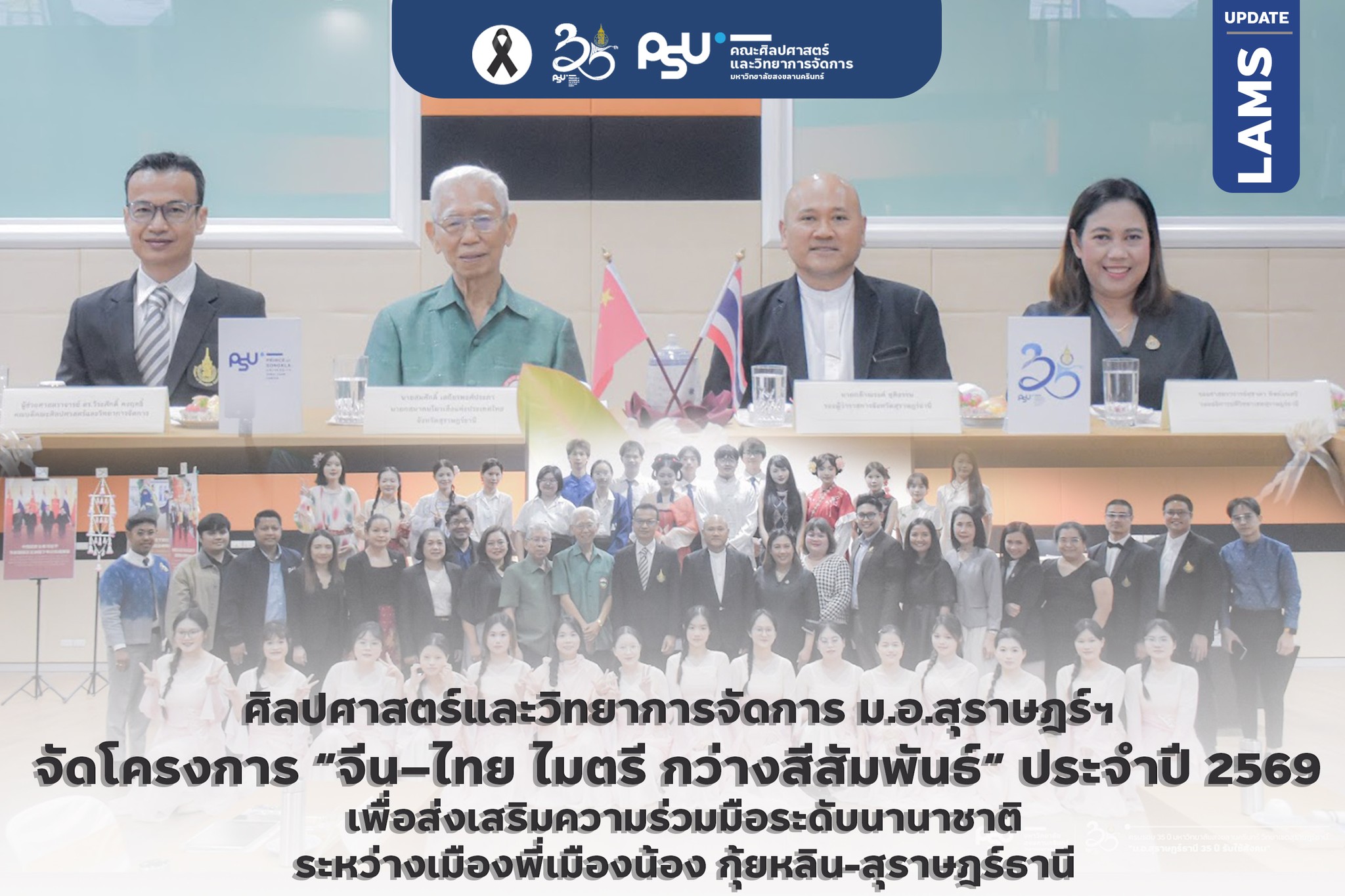 คณะศิลปศาสตร์และวิทยาการจัดการ มหาวิทยาลัยสงขลานครินทร์ วิทยาเขตสุราษฎร์ธานี จัดโครงการ “จีน–ไทย ไมตรี กว่างสีสัมพันธ์” ประจำปี 2569 เพื่อส่งเสริมความร่วมมือด้านการศึกษาระหว่างนักศึกษาแลกเปลี่ยนชาวจีนของคณะฯ กับภาคจังหวัดสุราษฎร์ธานี และส่งเสริมความร่วมมือระดับนานาชาติ