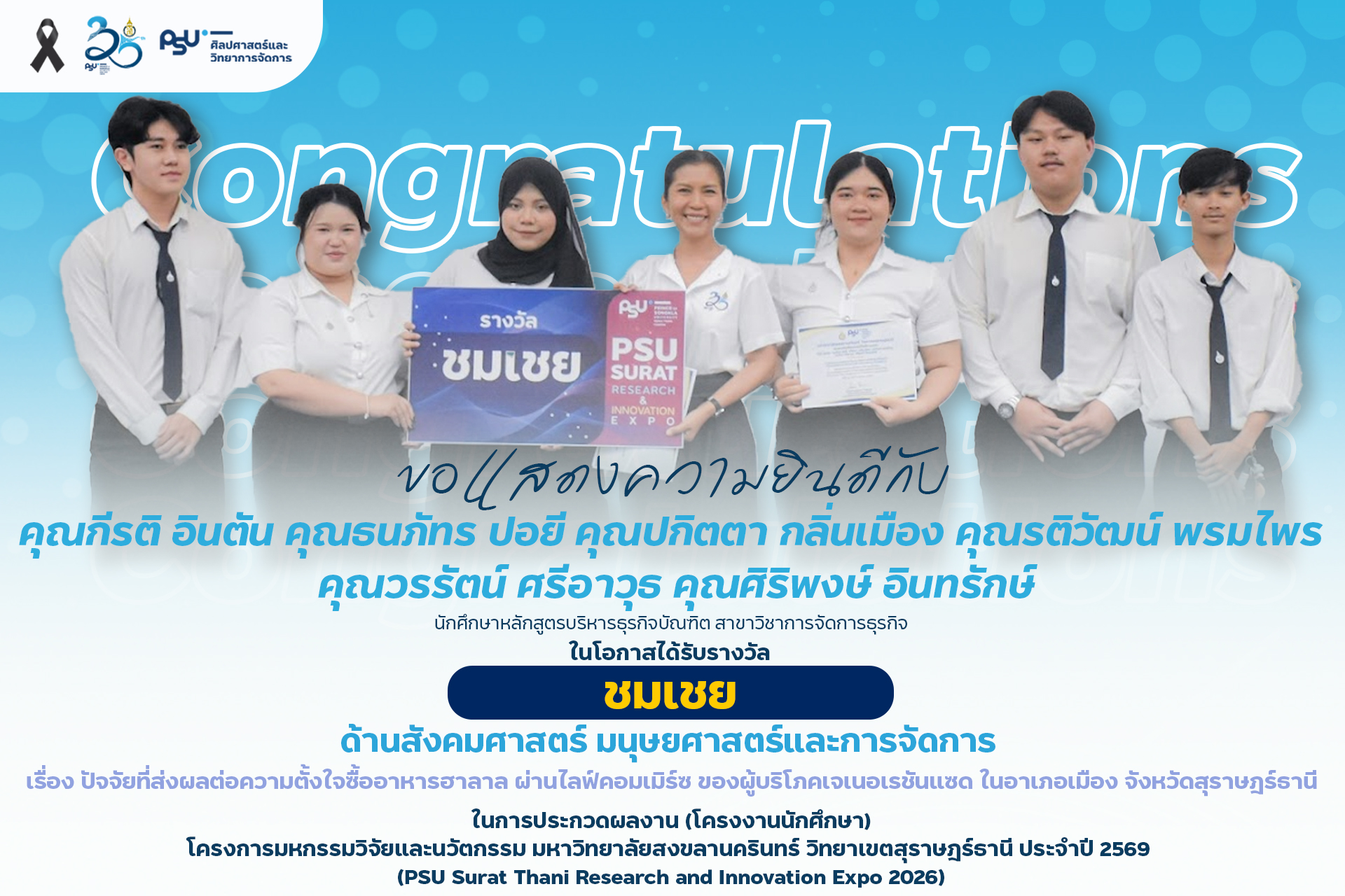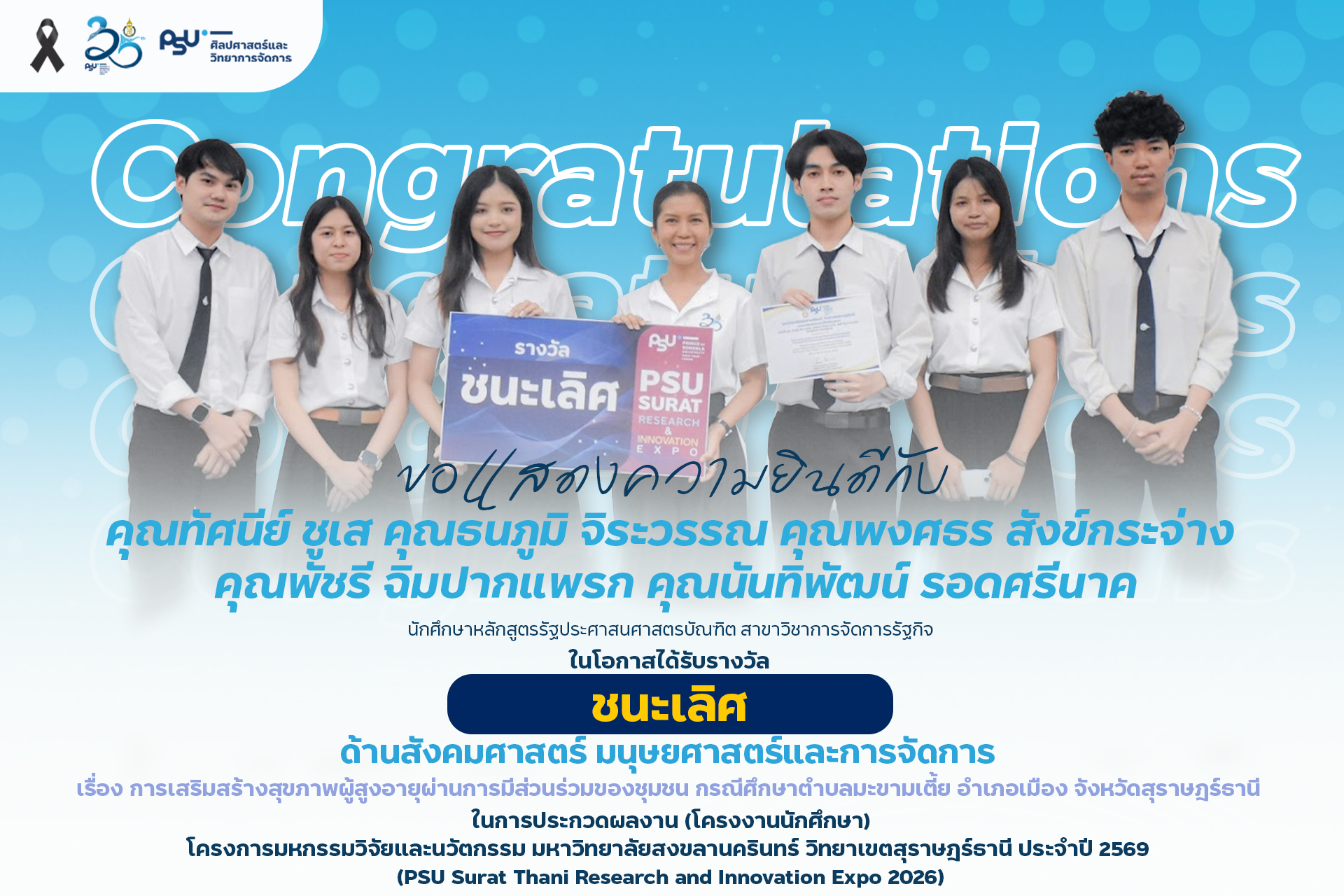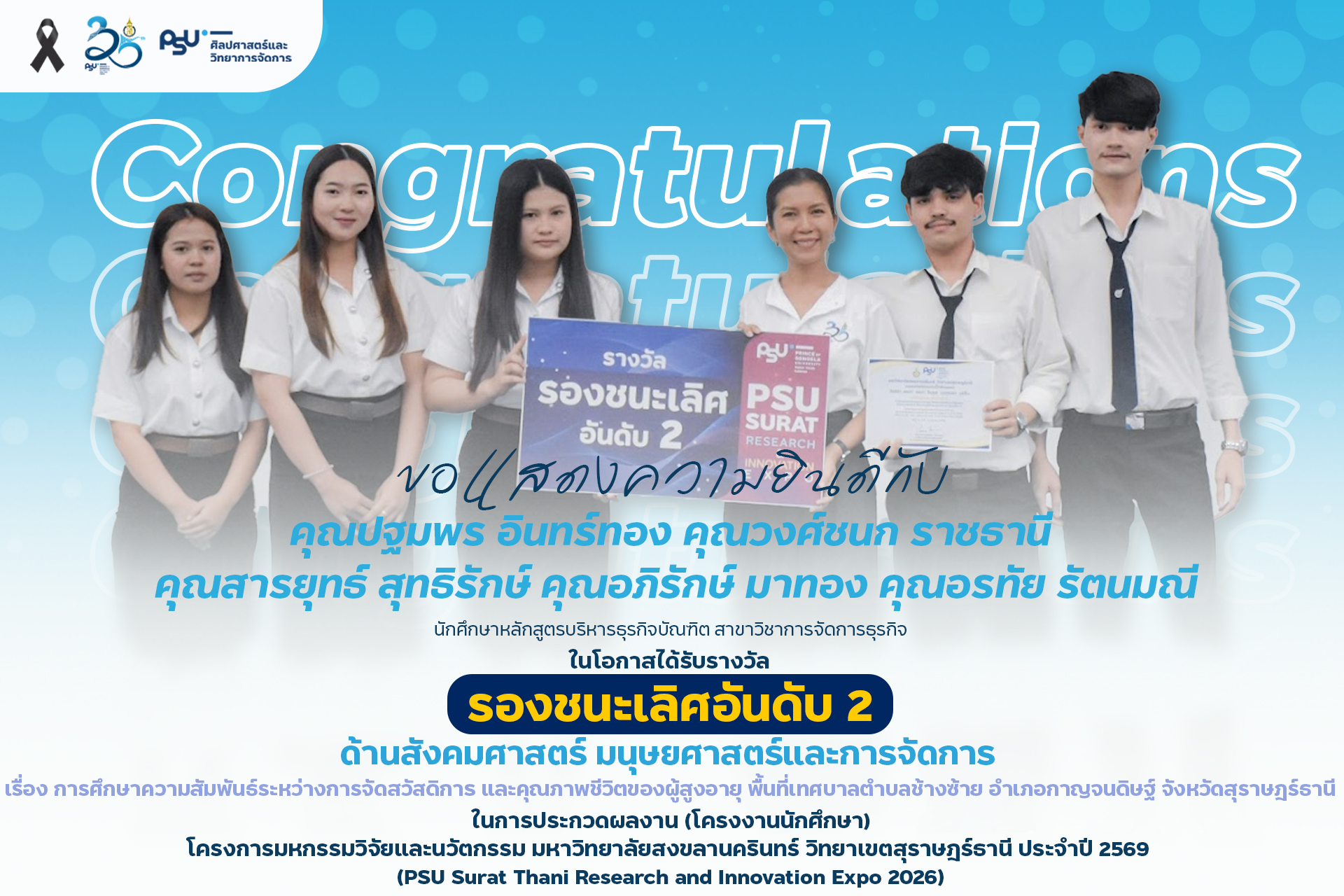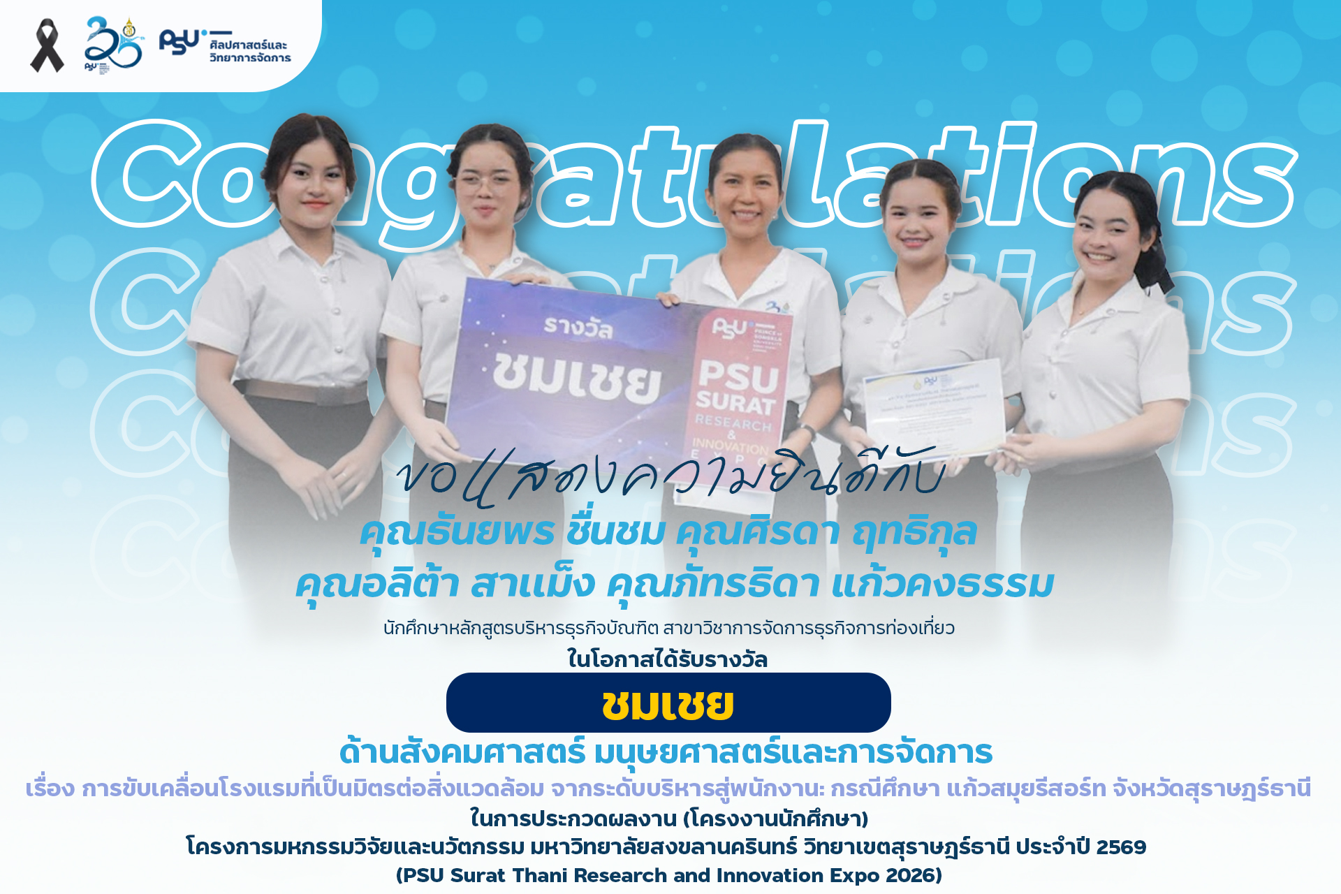 คณะศิลปศาสตร์และวิทยาการจัดการ มหาวิทยาลัยสงขลานครินทร์ วิทยาเขตสุราษฎร์ธานี ขอแสดงความยินดีกับนักศึกษาที่ได้รับรางวัลจากการประกวดผลงาน (โครงงานนักศึกษา) ด้านมนุษย์ศาสตร์ สังคมศาสตร์ และการจัดการ ในงาน PSU Surat Thani Research and Innovation Expo 2026