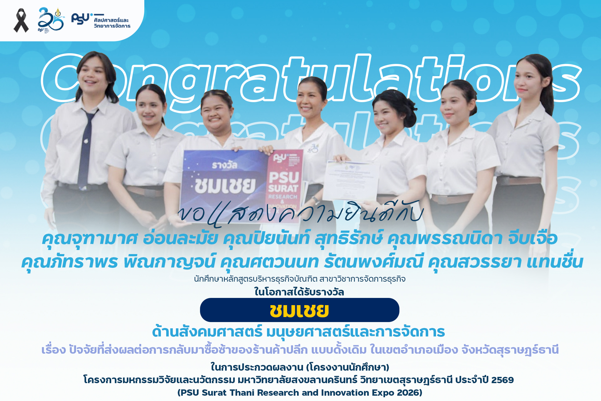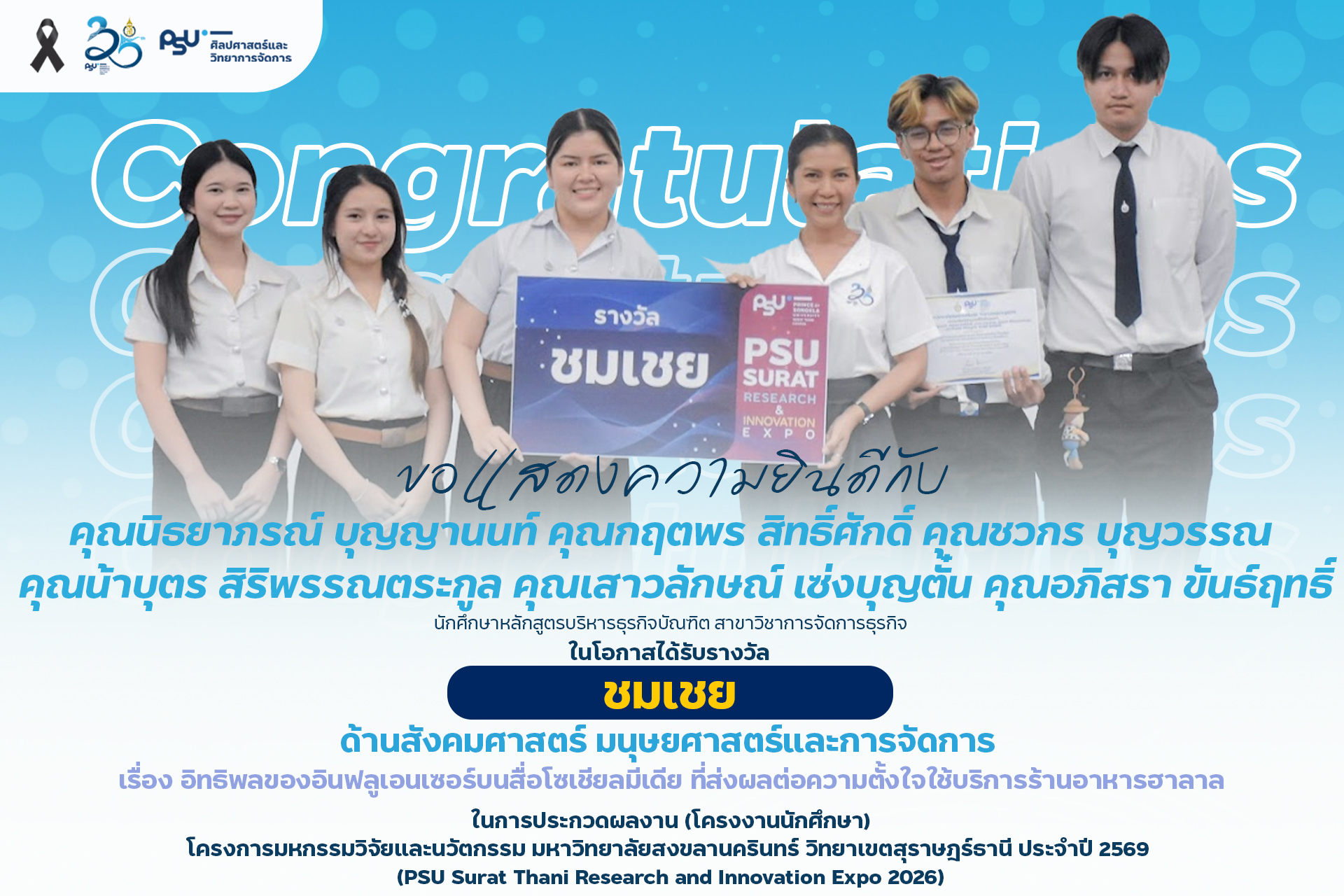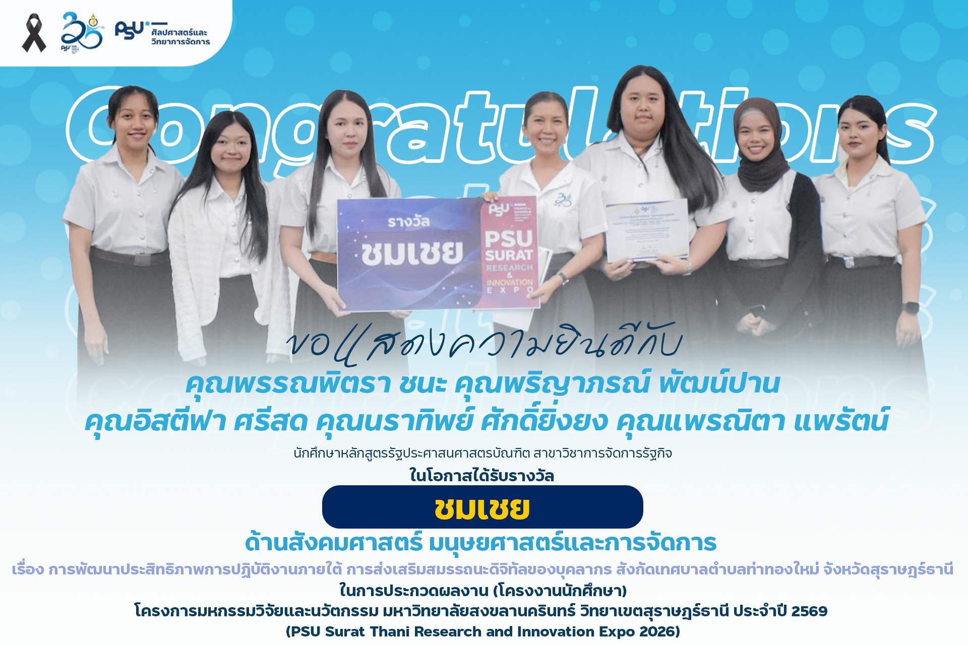 คณะศิลปศาสตร์และวิทยาการจัดการ มหาวิทยาลัยสงขลานครินทร์ วิทยาเขตสุราษฎร์ธานี ขอแสดงความยินดีกับนักศึกษาที่ได้รับรางวัลจากการประกวดผลงาน (โครงงานนักศึกษา) ด้านมนุษย์ศาสตร์ สังคมศาสตร์ และการจัดการ ในงาน PSU Surat Thani Research and Innovation Expo 2026