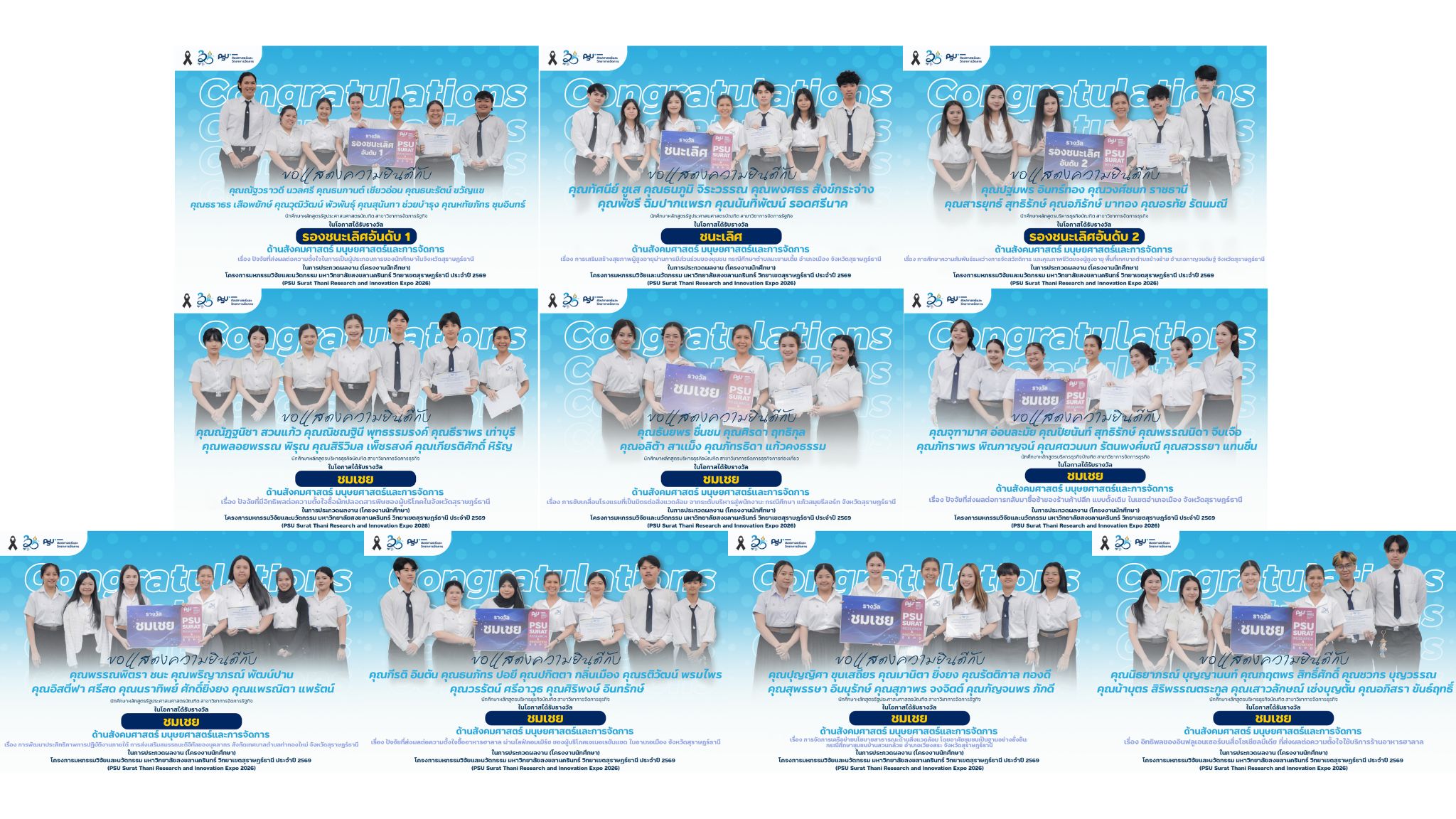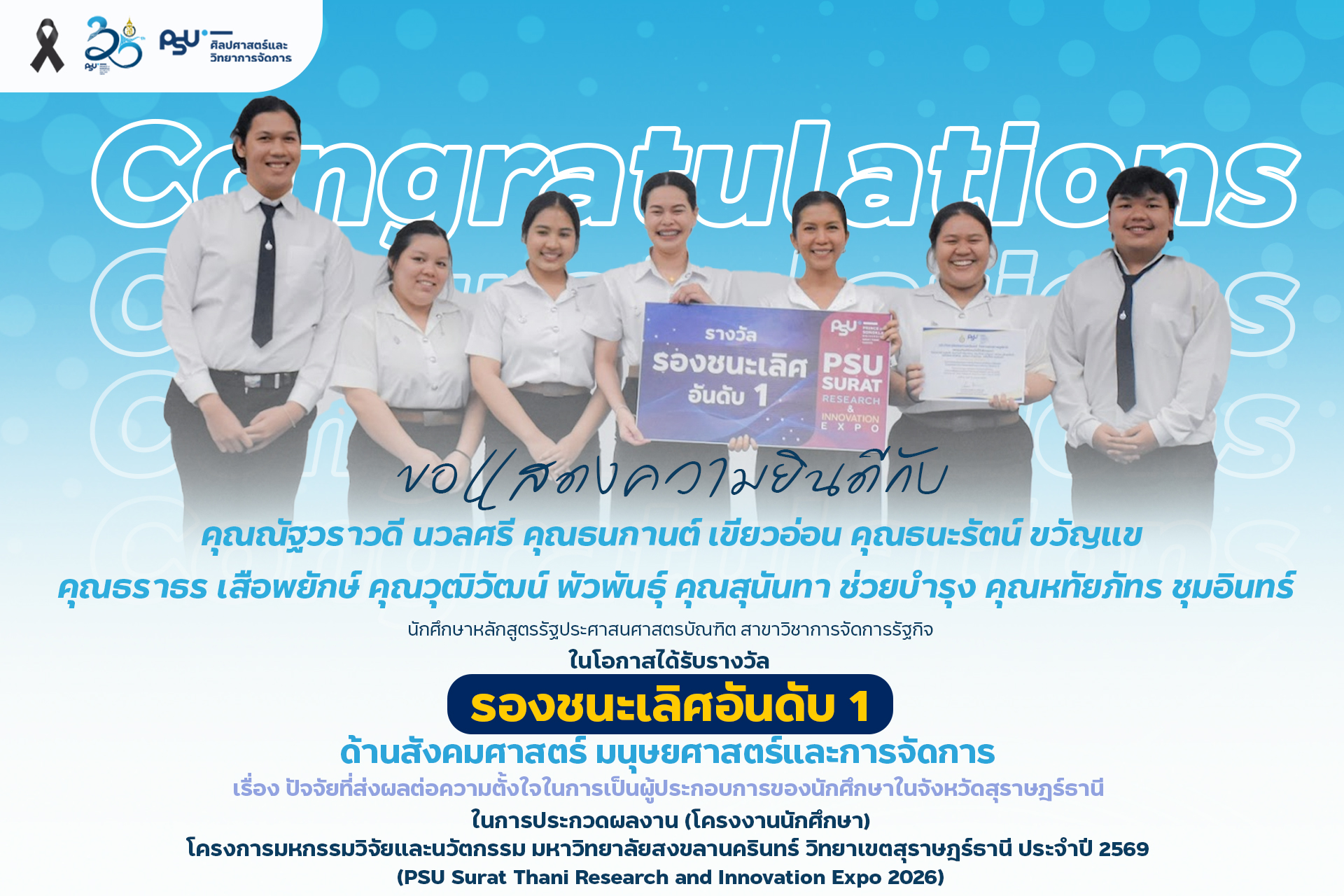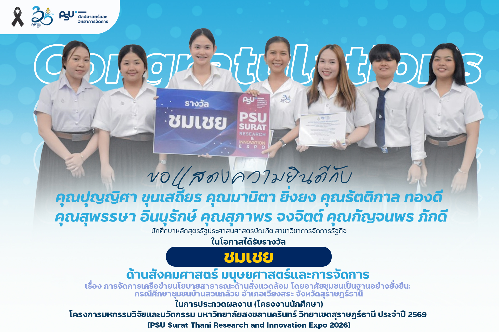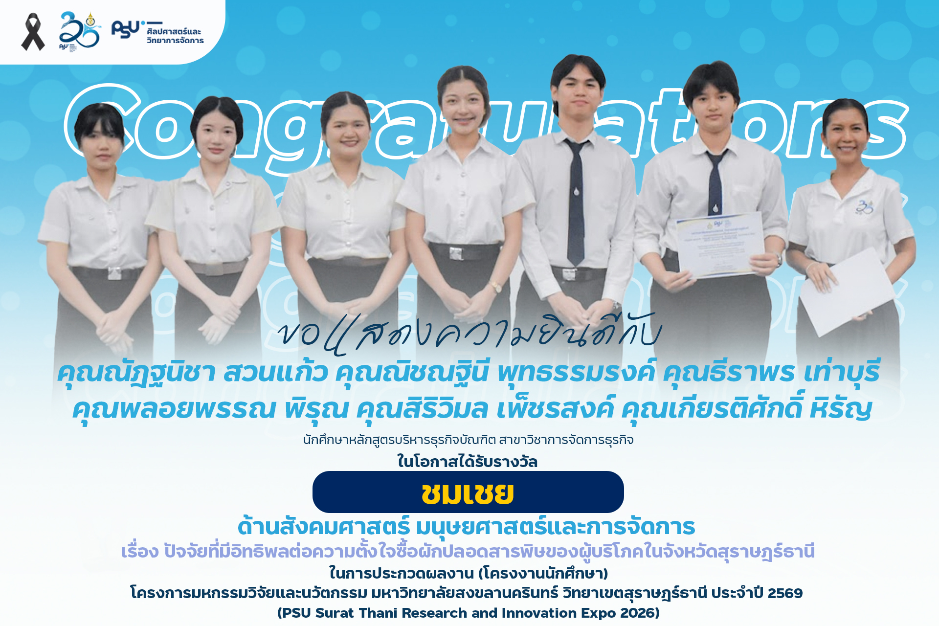 คณะศิลปศาสตร์และวิทยาการจัดการ มหาวิทยาลัยสงขลานครินทร์ วิทยาเขตสุราษฎร์ธานี ขอแสดงความยินดีกับนักศึกษาที่ได้รับรางวัลจากการประกวดผลงาน (โครงงานนักศึกษา) ด้านมนุษย์ศาสตร์ สังคมศาสตร์ และการจัดการ ในงาน PSU Surat Thani Research and Innovation Expo 2026