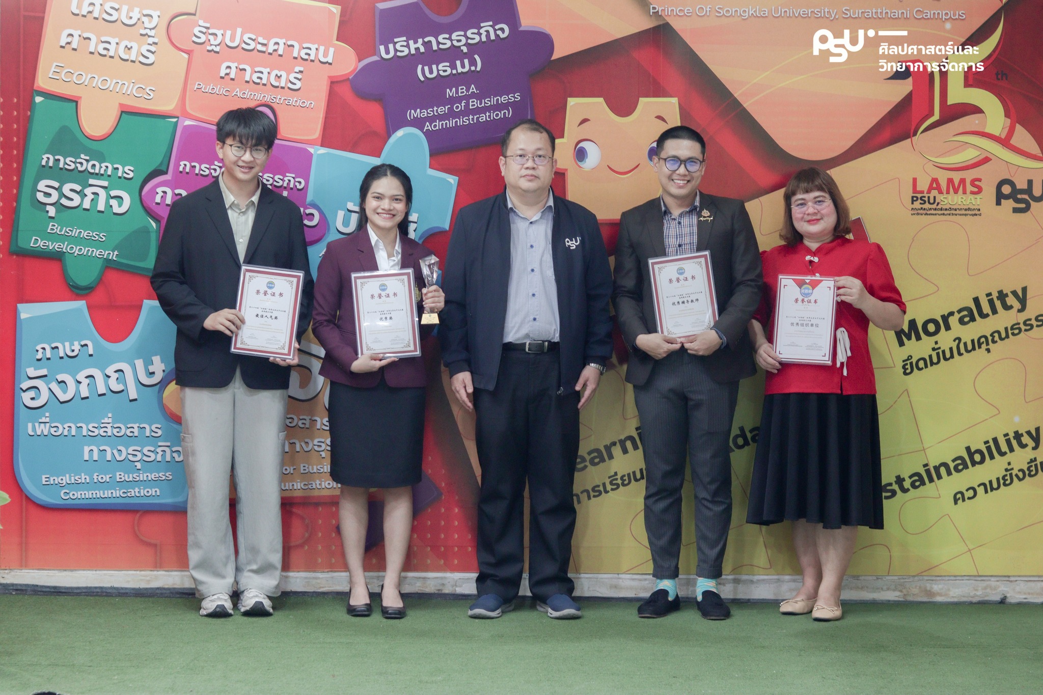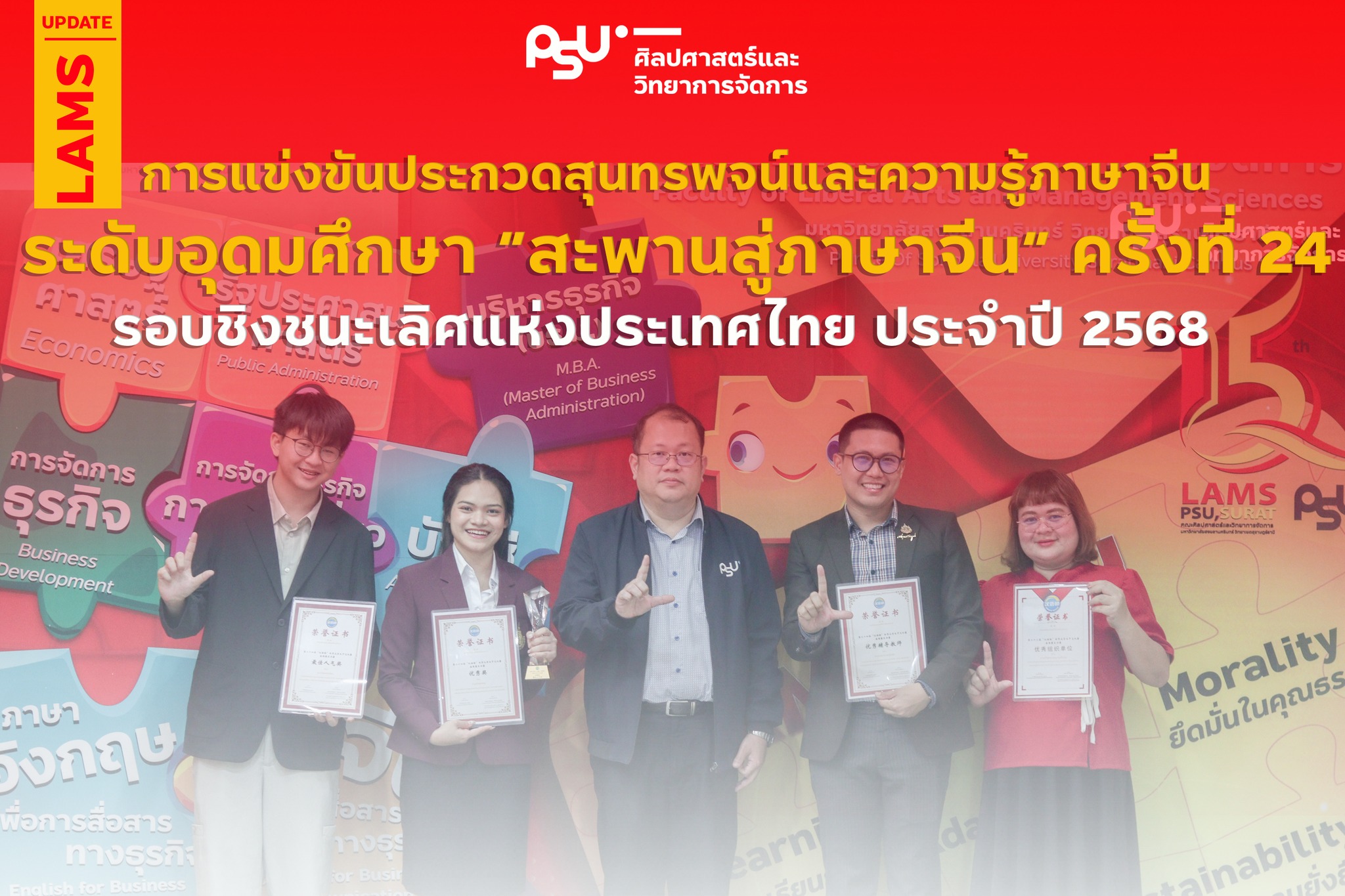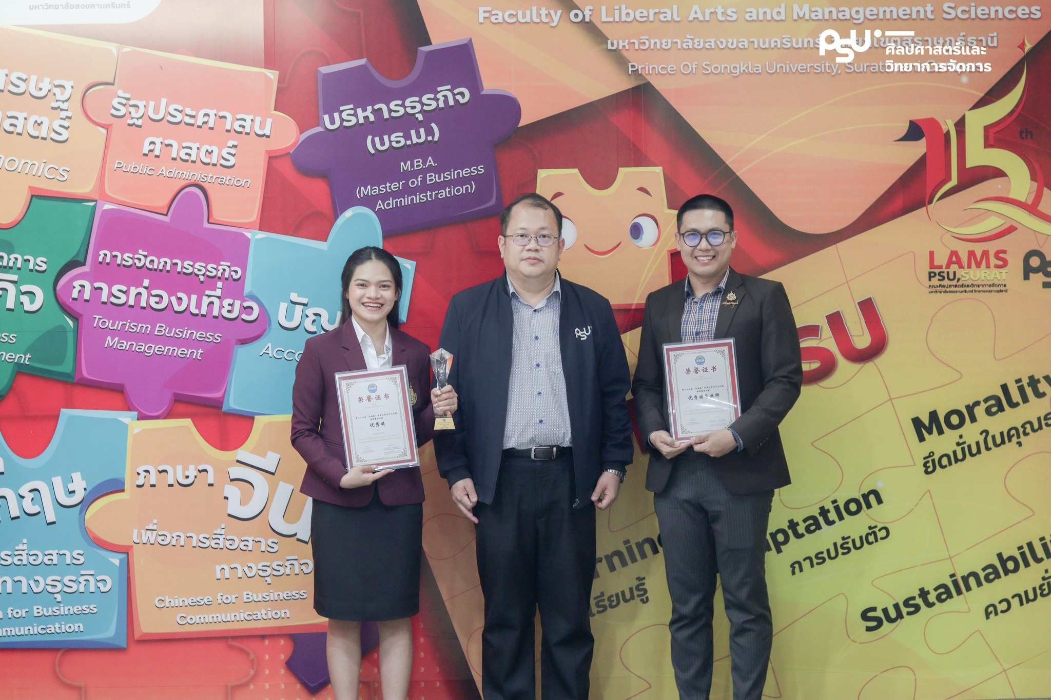 คณะศิลปศาสตร์และวิทยาการจัดการ ขอแสดงความยินดี กับ นางสาวญาณิศา เกื้อช่วย ได้รับ รางวัลชมเชย ระดับชาติ รางวัล Popular vote การแข่งขันทักษะภาษาจีน “สะพานภาษาจีน” ระดับอุดมศึกษา ครั้งที่ 24 รอบชิงชนะประเทศไทย ในโอการนี้ ขอแสดงความยินดี กับ ดร.พิชัย แก้วบุตร ได้รับรางวัลที่ปรึกษาดีเด่นระดับชาติ และมหาวิทยาลัยสงขลานครินทร์ วิทยาเขตสุราษฎร์ธานี ได้รับรางวัลหน่วยงานดีเด่นระดับชาติ ในการแข่งขันทักษะภาษาจีน “สะพานภาษาจีน” ระดับอุดมศึกษา ครั้งที่ 24 รอบชิงชนะประเทศไทย