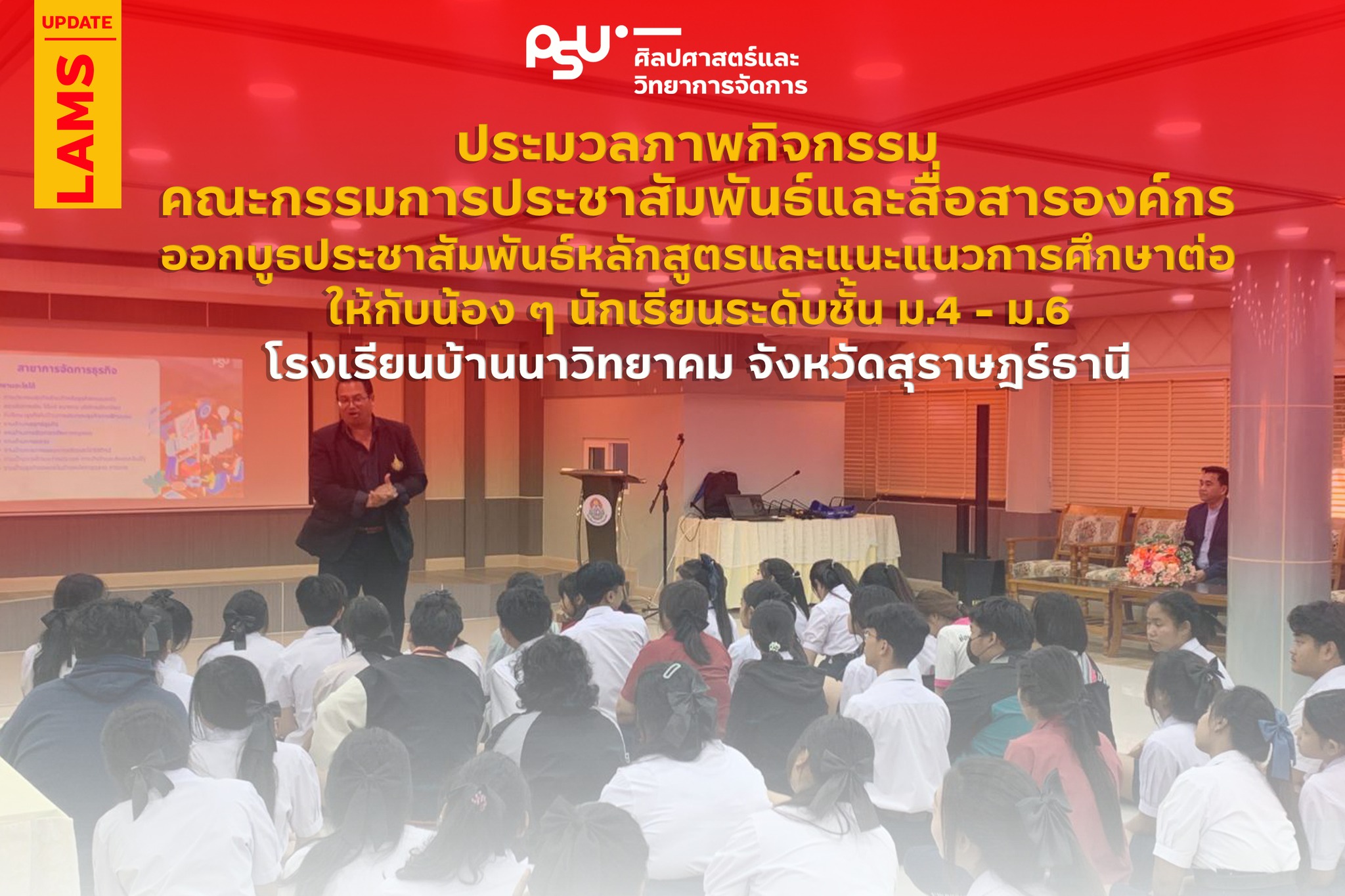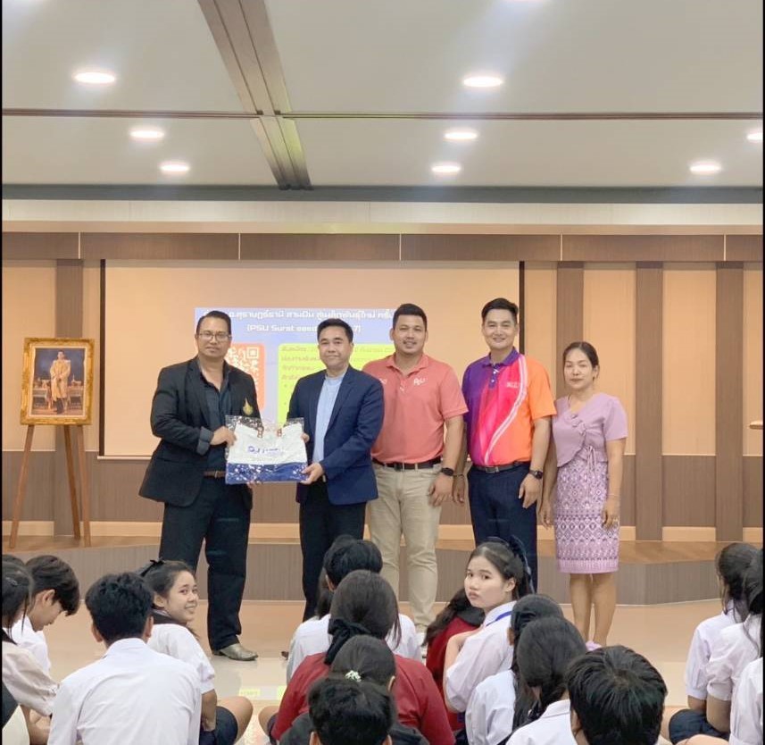 นำโดย ผู้ช่วยศาสตราจารย์ ว่าที่ร้อยตรี ดร.ธนภณ ภู่มาลา คณะกรรมการประชาสัมพันธ์และสื่อสารองค์กร คณะศิลปศาสตร์และวิทยาการจัดการ ร่วมกับวิทยาเขตสุราษฎร์ธานี ออกบูธประชาสัมพันธ์หลักสูตรและแนะแนวการศึกษาต่อให้กับน้อง ๆ นักเรียนระดับชั้น ม.4 - ม.6 ณ โรงเรียนบ้านนาวิทยาคม จังหวัดสุราษฎร์ธานี