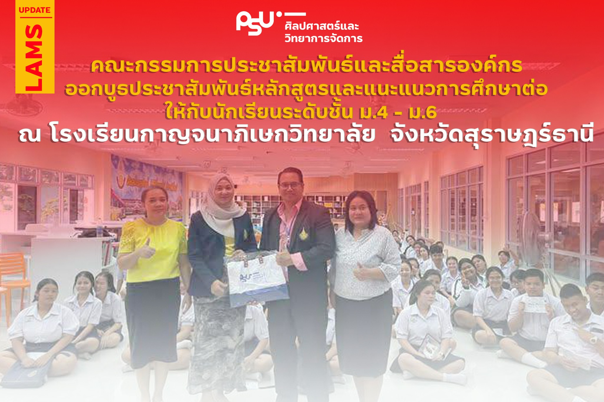 คณะศิลปศาสตร์และวิทยาการจัดการ ร่วมกับ วิทยาเขตสุราษฎร์ธานี นำโดย ผู้ช่วยศาสตราจารย์ ว่าที่ร้อยตรี ดร.ธนภณ ภู่มาลา ประธานคณะกรรมการประชาสัมพันธ์และสื่อสารองค์กร ได้จัดกิจกรรมออกบูธประชาสัมพันธ์หลักสูตร และแนะแนวการศึกษาต่อให้แก่น้อง ๆ นักเรียนระดับชั้น ม.4 – ม.6 ณ โรงเรียนกาญจนาภิเษกวิทยาลัย จังหวัดสุราษฎร์ธานี