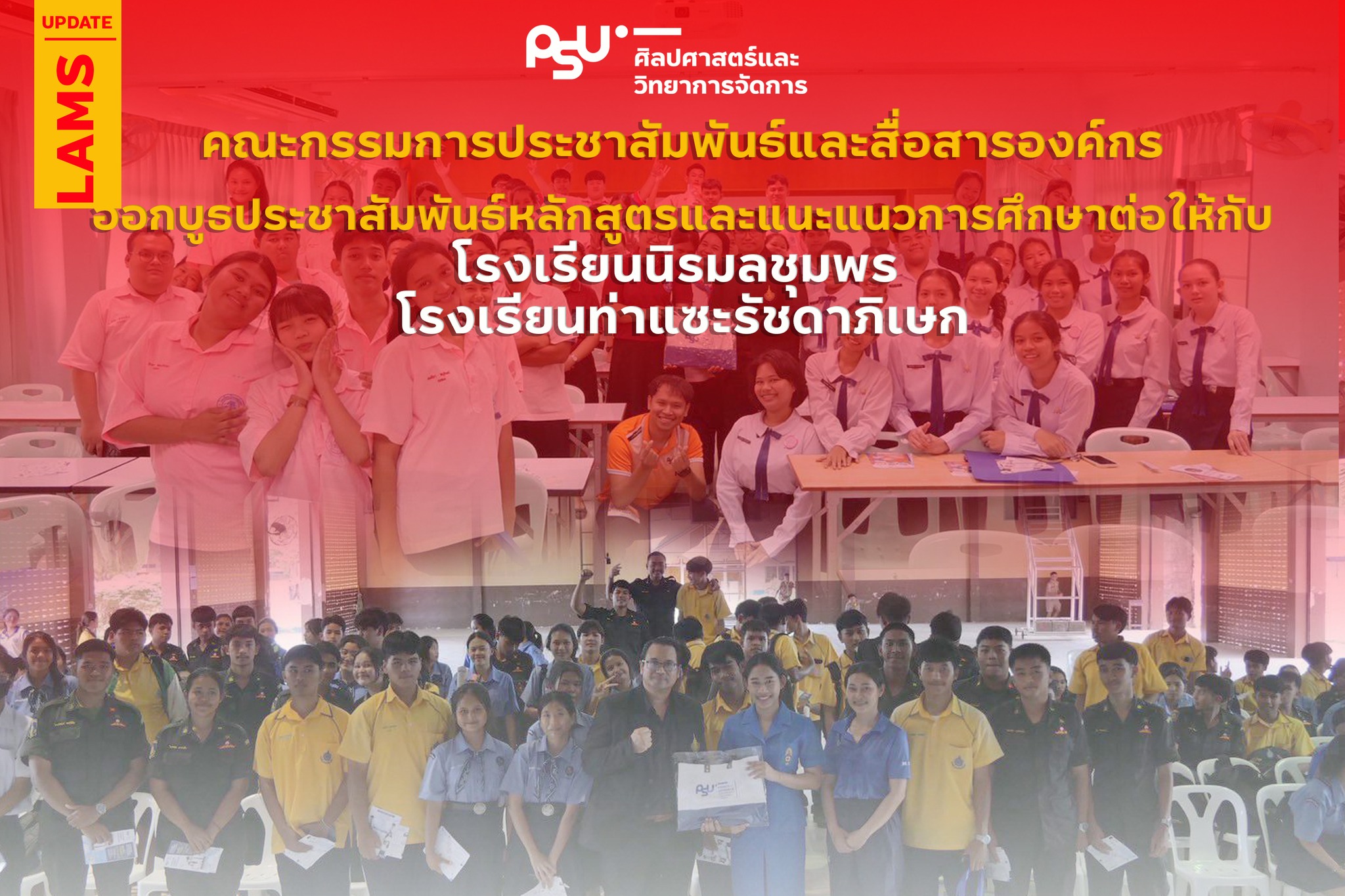 วันที่ 6 สิงหาคม 2568 นำโดย ผู้ช่วยศาสตราจารย์ ว่าที่ร้อยตรี ดร.ธนภณ ภู่มาลา คณะกรรมการประชาสัมพันธ์และสื่อสารองค์กร คณะศิลปศาสตร์และวิทยาการจัดการ ร่วมกับวิทยาเขตสุราษฎร์ธานี ออกบูธประชาสัมพันธ์หลักสูตรและแนะแนวการศึกษาต่อให้กับน้อง ๆ นักเรียนระดับชั้น ม.4 - ม.6 ณ โรงเรียนนิรมลชุมพร โรงเรียนท่าแซะรัชดาภิเษก