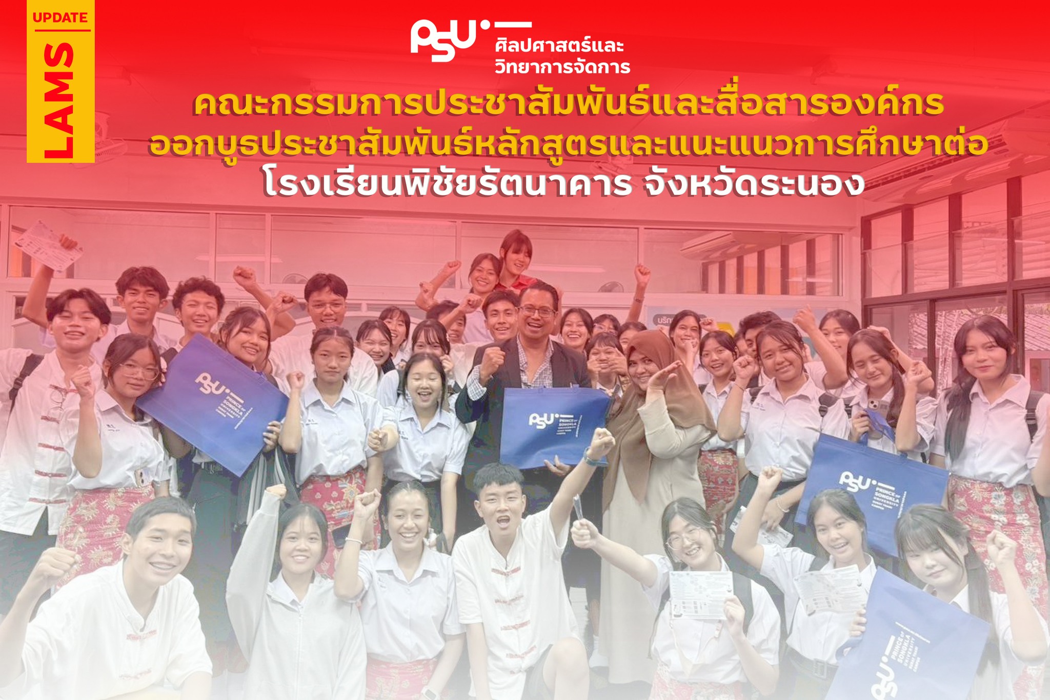 ประมวลภาพกิจกรรม วันที่ 8 สิงหาคม 2568 นำโดย ผู้ช่วยศาสตราจารย์ ว่าที่ร้อยตรี ดร.ธนภณ ภู่มาลา คณะกรรมการประชาสัมพันธ์และสื่อสารองค์กร คณะศิลปศาสตร์และวิทยาการจัดการ ร่วมกับวิทยาเขตสุราษฎร์ธานี ออกบูธประชาสัมพันธ์หลักสูตรและแนะแนวการศึกษาต่อให้กับน้อง ๆ นักเรียนระดับชั้น ม.4 - ม.6 ณ โรงเรียนพิชัยรัตนาคาร จังหวัดระนอง