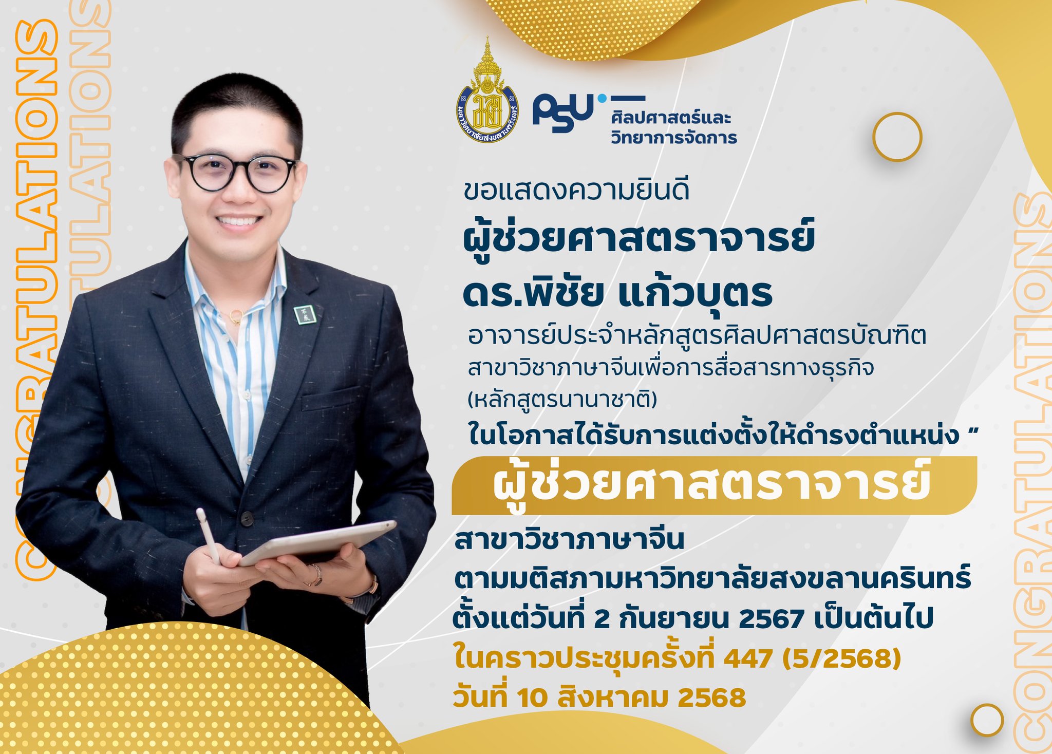 ในโอกาสได้รับการแต่งตั้งให้ดำรงตำแหน่ง ผู้ช่วยศาสตราจารย์ สาขาวิชารัฐศาสตร์ ตามมติสภามหาวิทยาลัยสงขลานครินทร์ ในคราวประชุมครั้งที่ 447 (5/2568) เมื่อวันที่ 10 สิงหาคม 2568