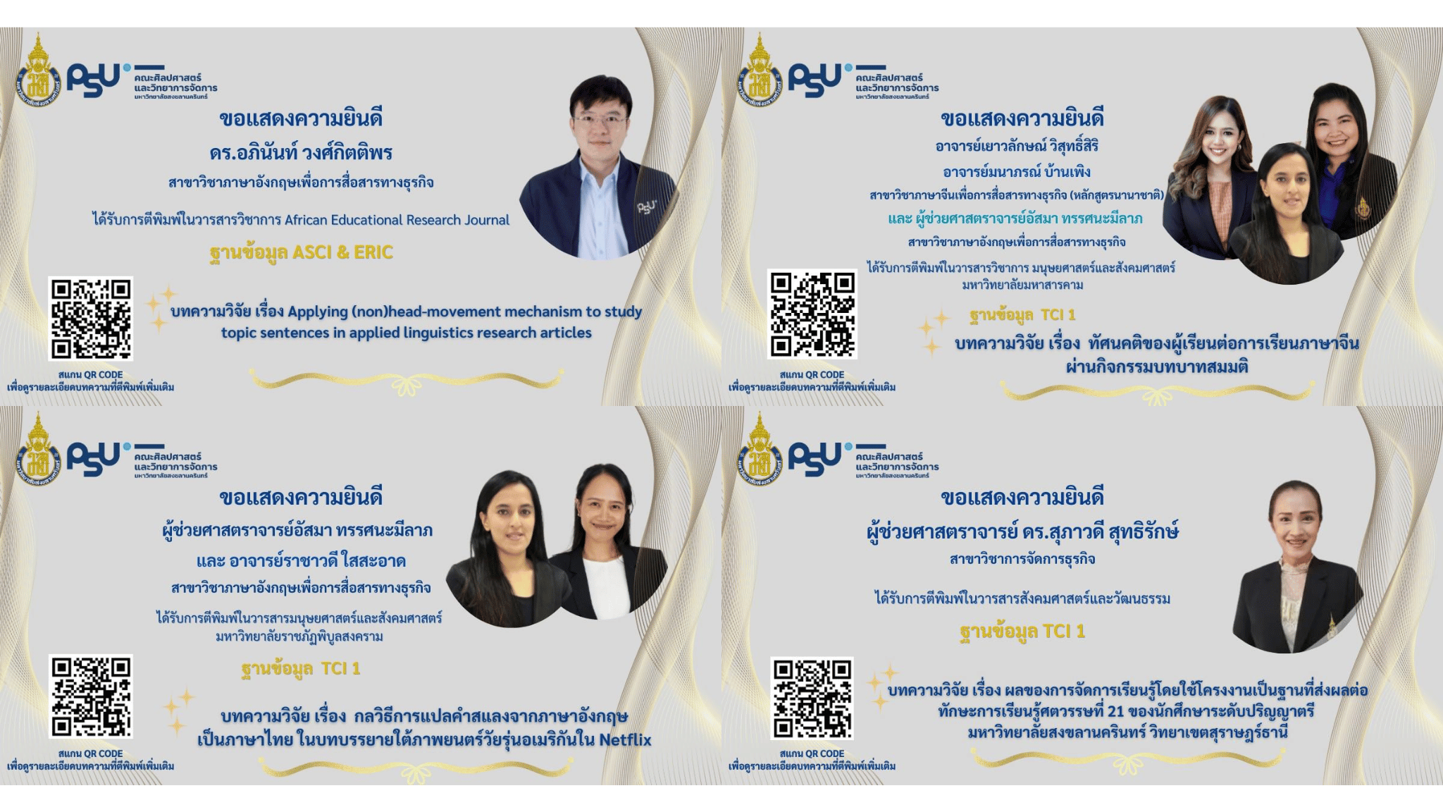 คณะศิลปศาสตร์และวิทยาการจัดการ มหาวิทยาลัยสงขลานครินทร์ วิทยาเขตสุราษฎร์ธานี ขอร่วมแสดงความยินดีอย่างยิ่งแก่ คณาจารย์ทุกท่าน ในโอกาสที่ผลงานวิจัยได้รับการตีพิมพ์ในวารสารวิชาการระดับคุณภาพ