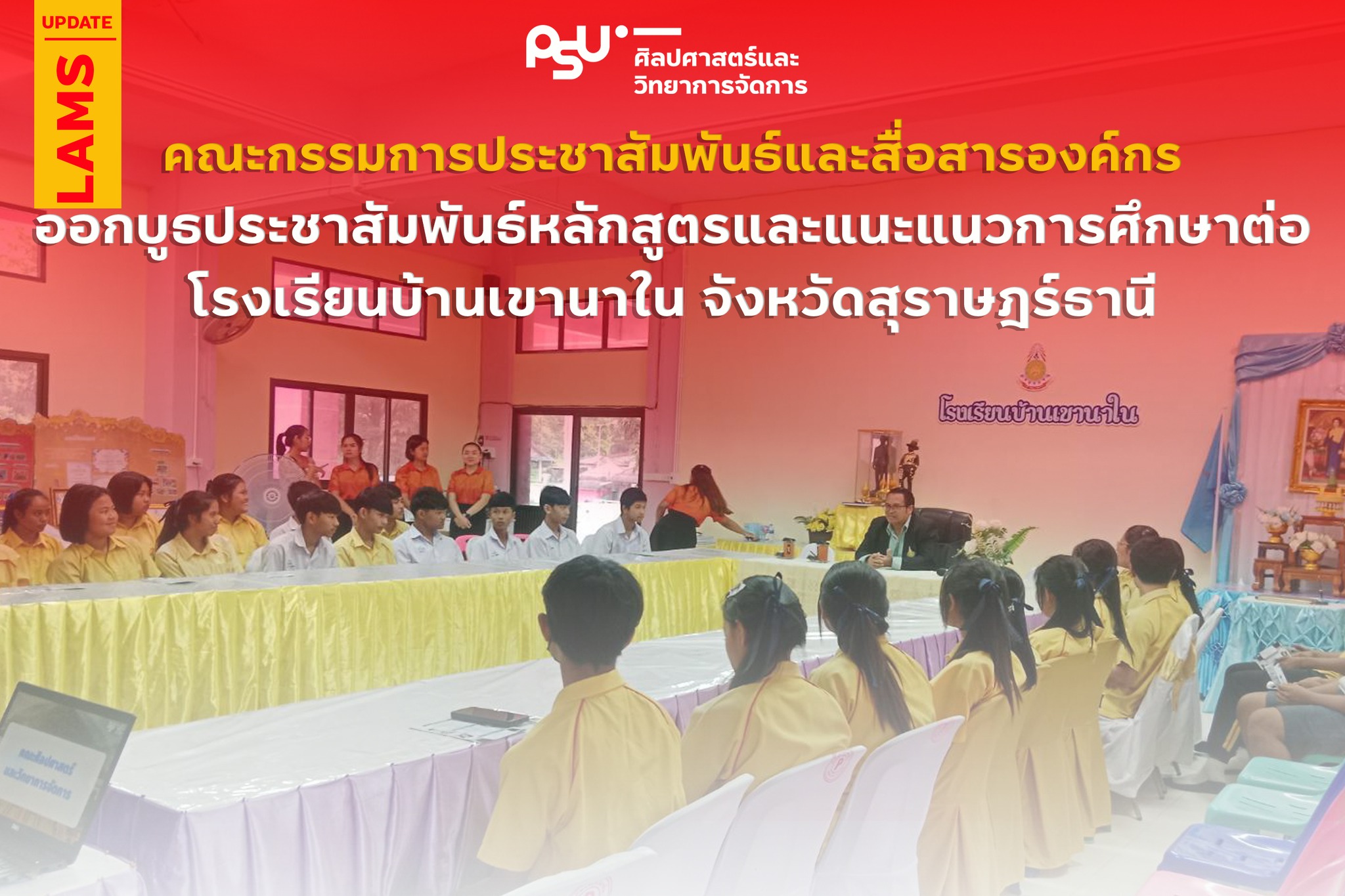 วันที่ 21 สิงหาคม 2568 นำโดย ผู้ช่วยศาสตราจารย์ ว่าที่ร้อยตรี ดร.ธนภณ ภู่มาลา คณะกรรมการประชาสัมพันธ์และสื่อสารองค์กร คณะศิลปศาสตร์และวิทยาการจัดการ ร่วมกับวิทยาเขตสุราษฎร์ธานี ออกบูธประชาสัมพันธ์หลักสูตรและแนะแนวการศึกษาต่อให้กับน้อง ๆ นักเรียนระดับชั้น ม.4 - ม.6 ณ โรงเรียนบ้านเขานาใน จังหวัดสุราษฎร์ธานี