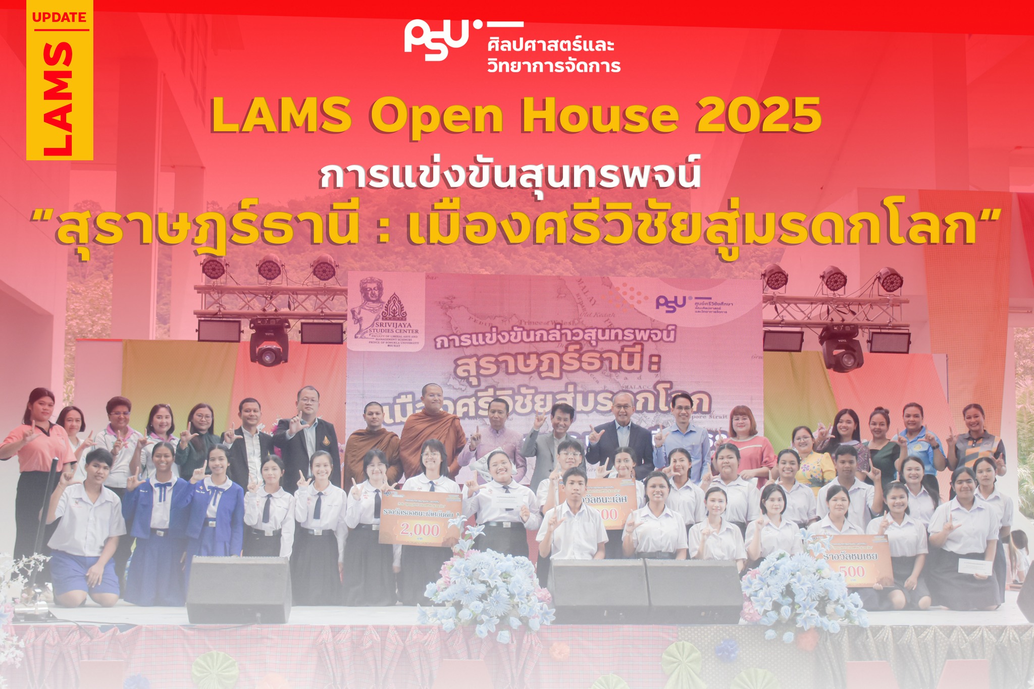 เมื่อวันที่ 19 สิงหาคม 2568 ณ มหาวิทยาลัยสงขลานครินทร์ วิทยาเขตสุราษฎร์ธานี คณะศิลปศาสตร์และวิทยาการจัดการ ได้จัดกิจกรรม การแข่งขันสุนทรพจน์ “สุราษฎร์ธานี : เมืองศรีวิชัยสู่มรดกโลก” ภายใต้กิจกรรม LAMS Open House 2025 ซึ่งเป็นส่วนหนึ่งของงาน ม.อ.วิชาการ 2568