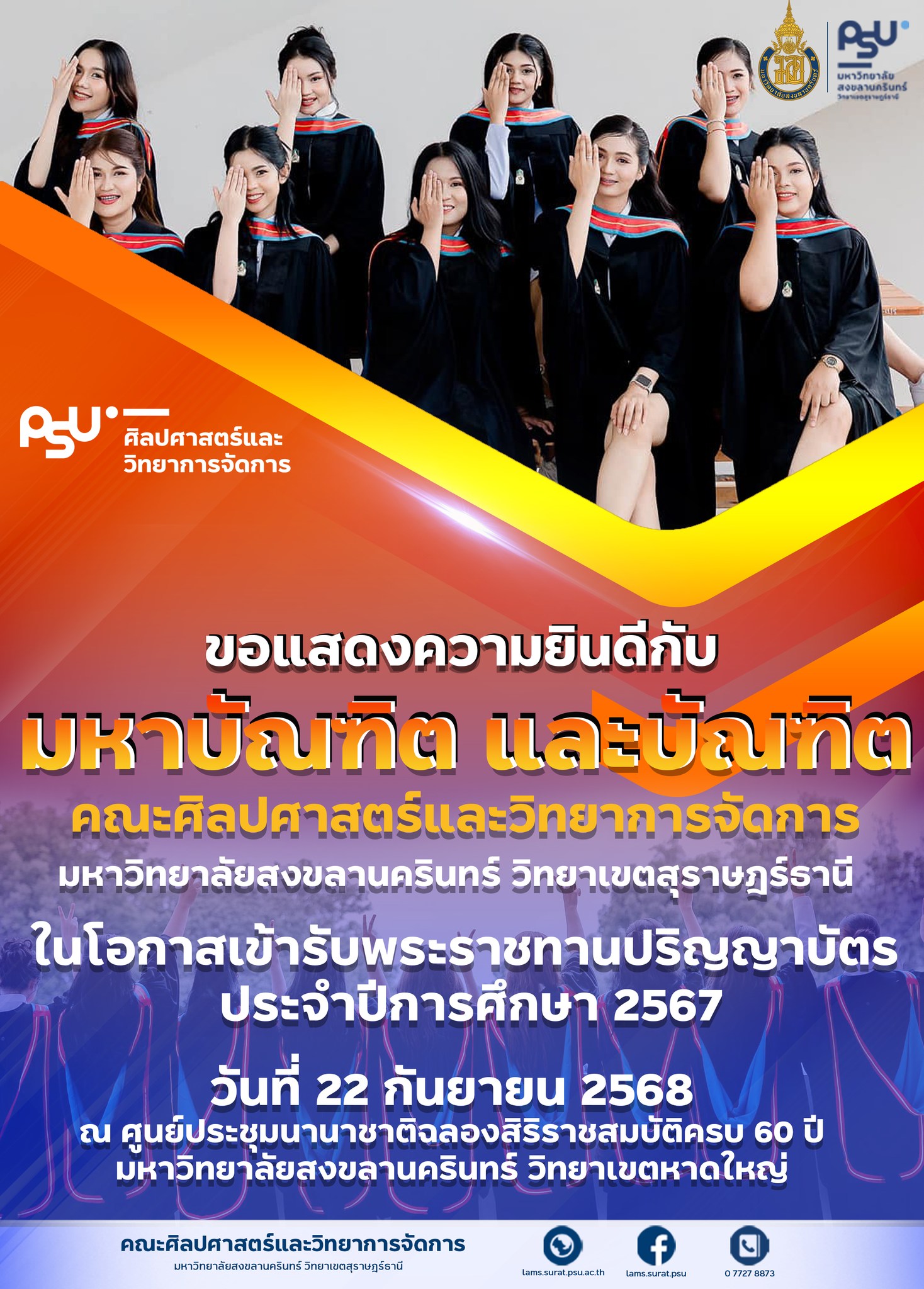 ขอแสดงความยินดีกับ มหาบัณฑิต และบัณฑิต ทุกท่าน ในโอกาสเข้ารับพระราชทานปริญญาบัตร ประจำปีการศึกษา 2567 วันที่ 22 กันยายน 2568 ณ ศูนย์ประชุมนานาชาติสิริราชสมบัติครบ ๖๐ ปี มหาวิทยาลัยสงขลานครินทร์