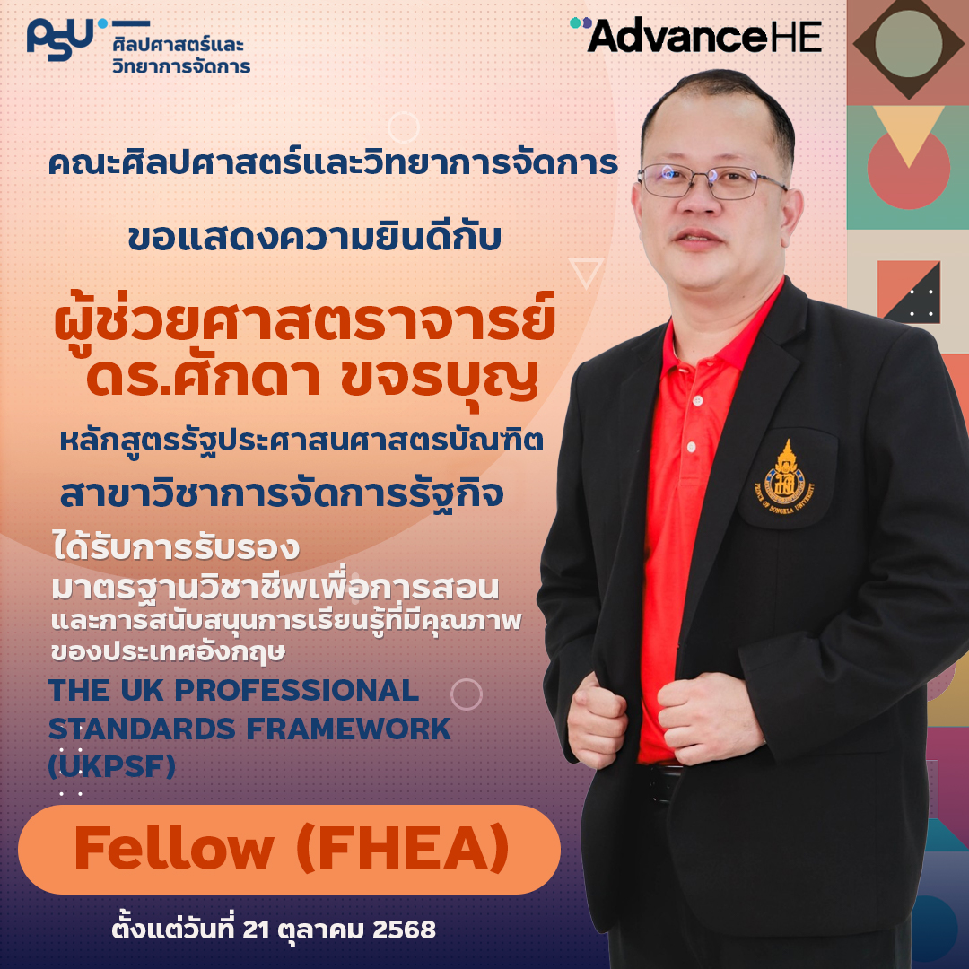 ขอแสดงความยินดีกับ ผู้ช่วยศาสตราจารย์ ดร.ศักดา ขจรบุญ อาจารย์ประจำหลักสูตรรัฐประศาสนศาสตรบัณฑิต สาขาวิชาการจัดการรัฐกิจ ในโอกาสได้รับการรับรองมาตรฐานวิชาชีพเพื่อการสอนและการสนับสนุนการเรียนรู้ที่มีคุณภาพของประเทศอังกฤษ THE UK PROFESSIONAL STANDARDS FRAMEWORK (UKPSF) ระดับ Fellow (FHEA) เมื่อวันที่ 21 ตุลาคม 2568