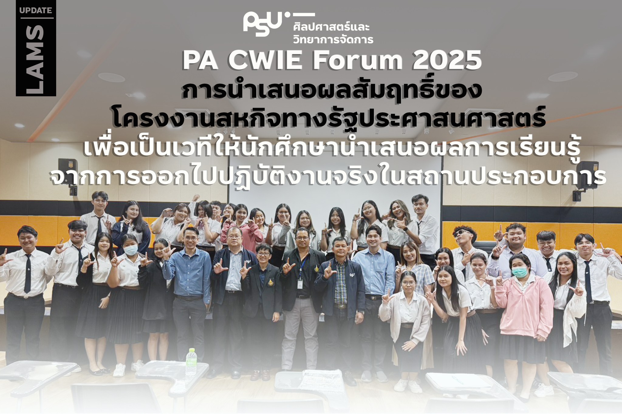 หลักสูตรรัฐประศาสนศาสตรบัณฑิต สาขาวิชาการจัดการรัฐกิจ ได้จัดกิจกรรม “PA CWIE Forum 2025” เพื่อเป็นเวทีให้นักศึกษานำเสนอผลการเรียนรู้จากการออกไปปฏิบัติงานจริงในสถานประกอบการ