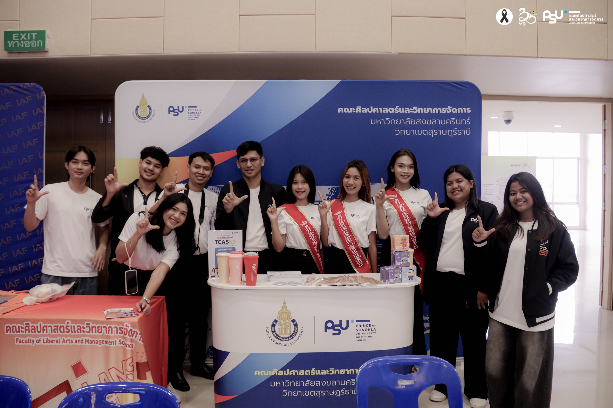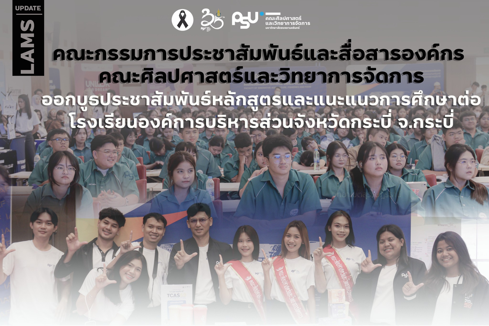 วันที่ 3 พฤศจิกายน 2568 ที่ผ่านมา รองศาสตราจารย์นพพร บัวอินทร์ พร้อมทีมคณะกรรมการประชาสัมพันธ์และสื่อสารองค์กร คณะศิลปศาสตร์และวิทยาการจัดการ มหาวิทยาลัยสงขลานครินทร์ ได้เข้าร่วมโครงการประชาสัมพันธ์หลักสูตรและการคัดเลือกบุคคลเข้าศึกษาในมหาวิทยาลัยสงขลานครินทร์ สำหรับนักเรียนโรงเรียนมัธยมศึกษาตอนปลายในภาคใต้ ประจำปีการศึกษา 2569 ณ โรงเรียนองค์การบริหารส่วนจังหวัดกระบี่ จ.กระบี่ โดยได้ออกบูธเพื่อแนะนำหลักสูตรและให้คำแนะนำในการศึกษาต่อในระดับอุดมศึกษากับนักเรียนระดับชั้น ม.4 - ม.6