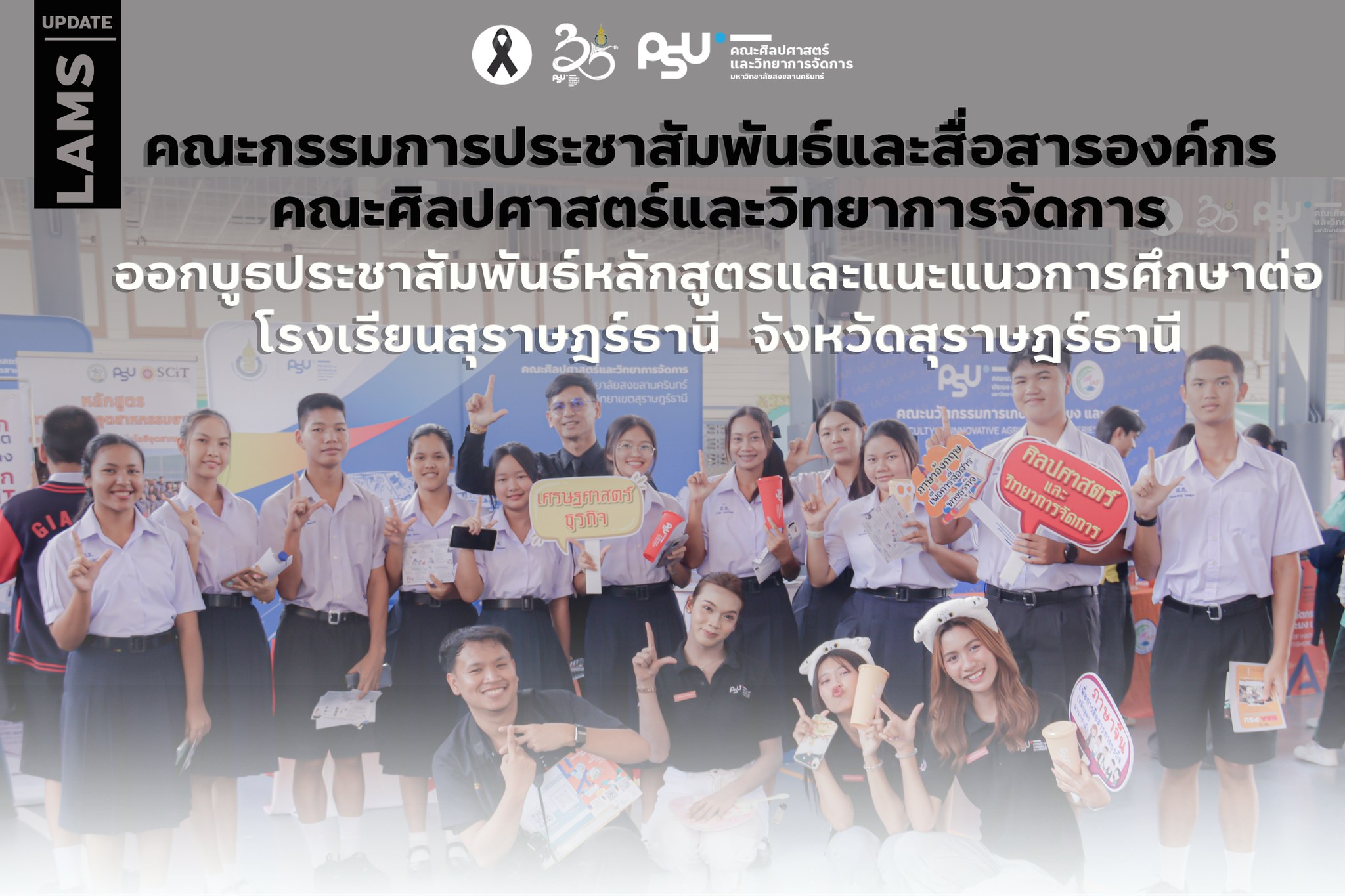 เมื่อวันที่ 4 พฤศจิกายน 2568 ที่ผ่านมา รองศาสตราจารย์นพพร บัวอินทร์ พร้อมทีมบุคลากรและนักศึกษาคณะศิลปศาสตร์และวิทยาการจัดการ มหาวิทยาลัยสงขลานครินทร์ (ม.อ.) เข้าร่วมกิจกรรมประชาสัมพันธ์หลักสูตรและแนะแนวการศึกษาต่อให้กับน้องๆ ม.4–ม.6 ณ โรงเรียนสุราษฎร์ธานี จังหวัดสุราษฎร์ธานี
