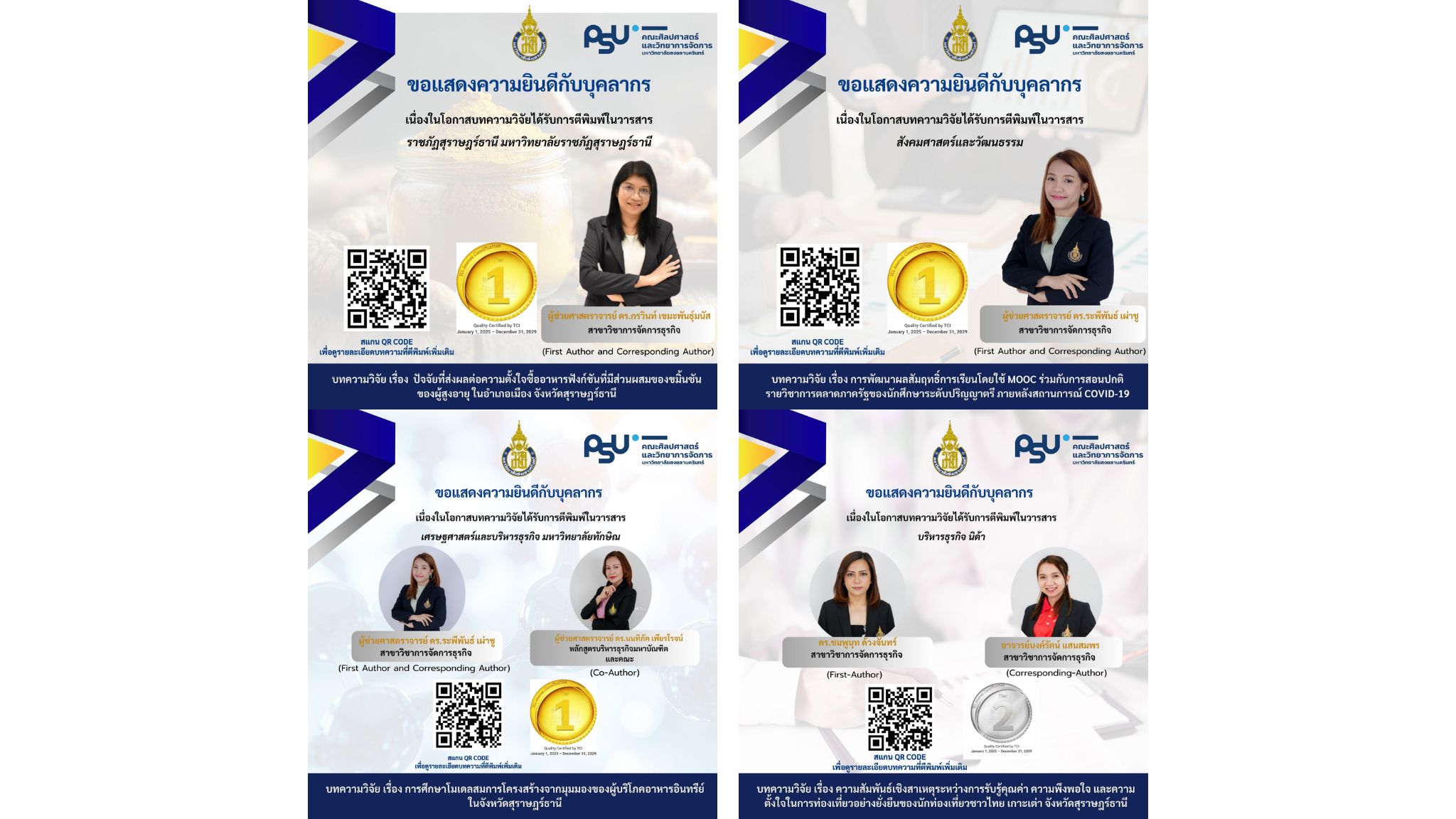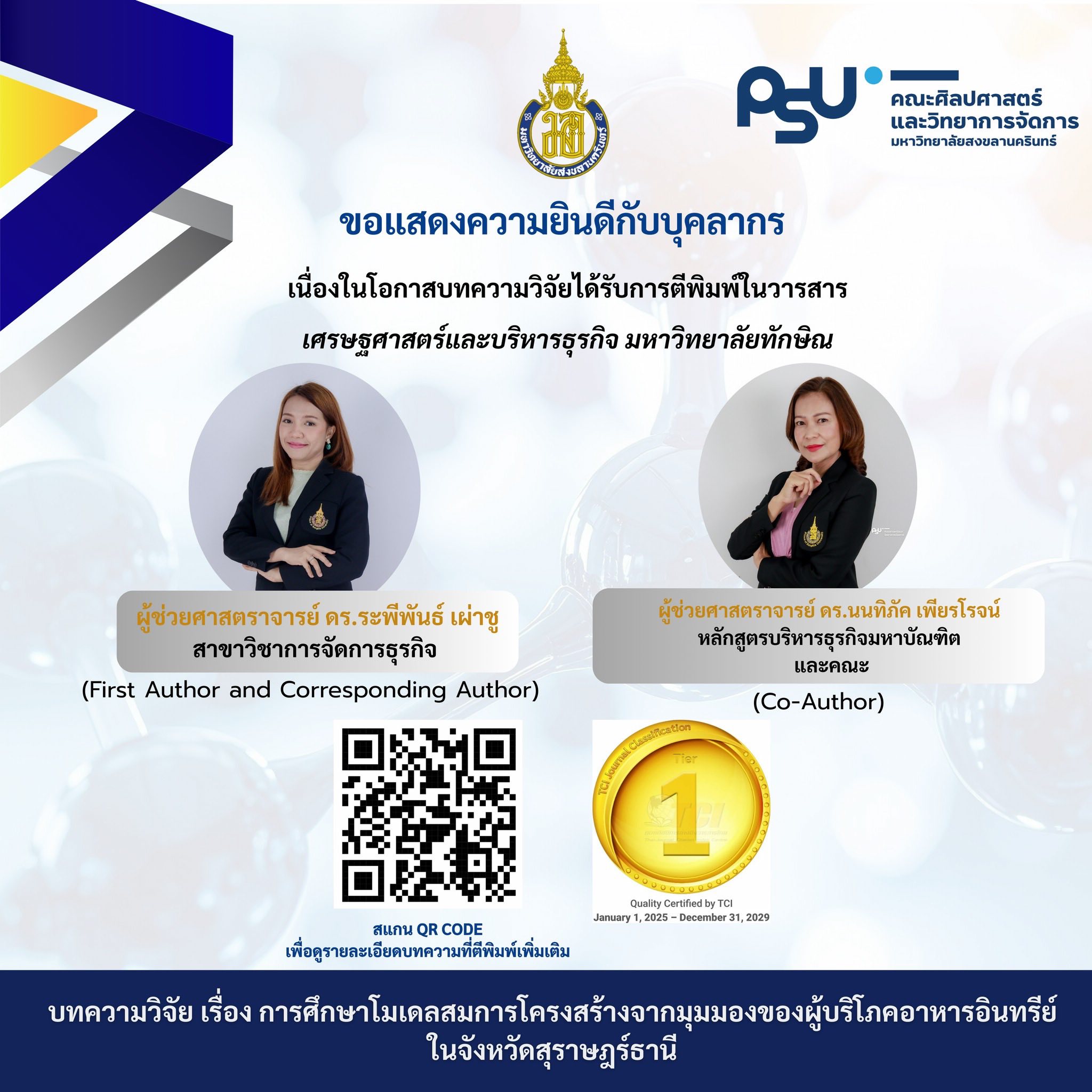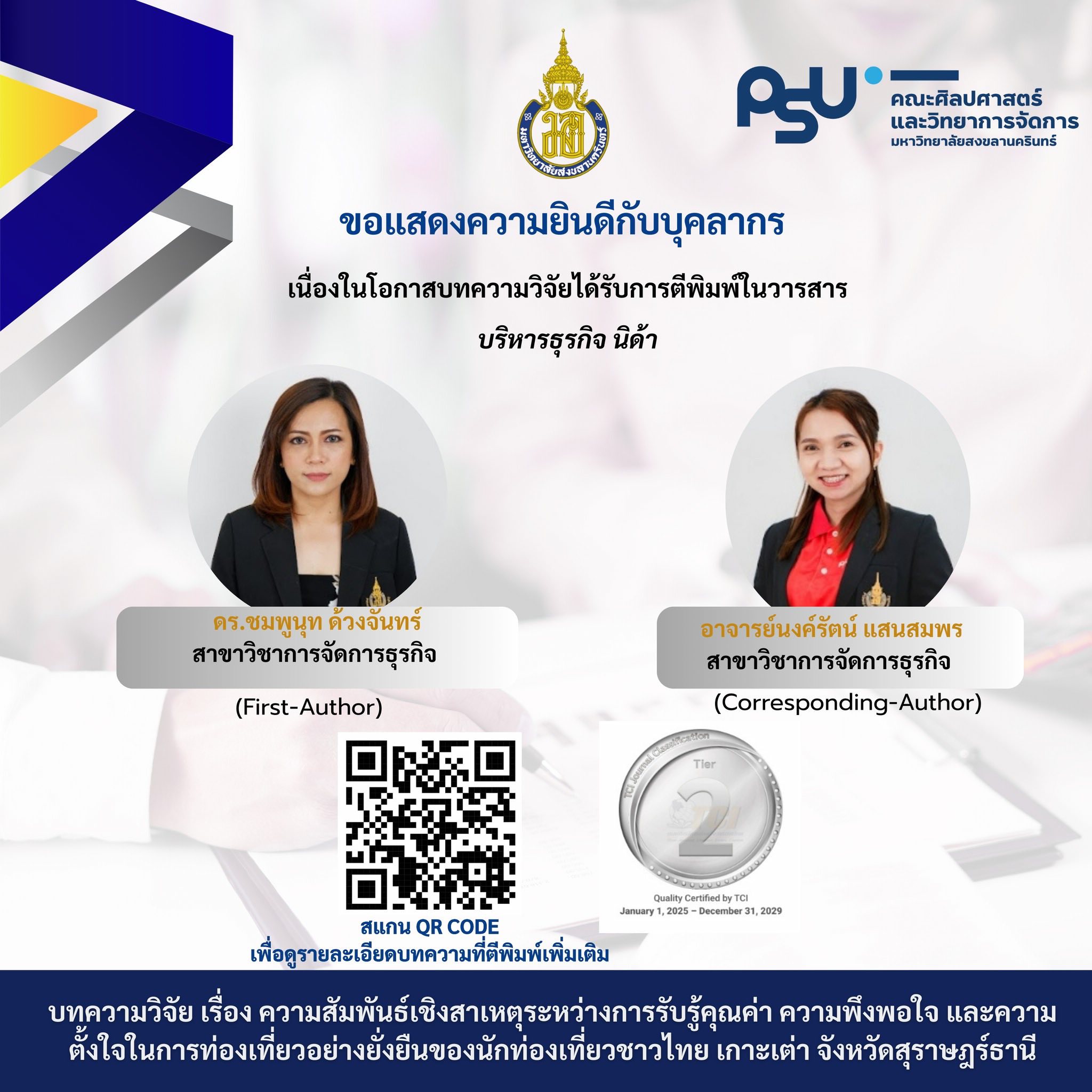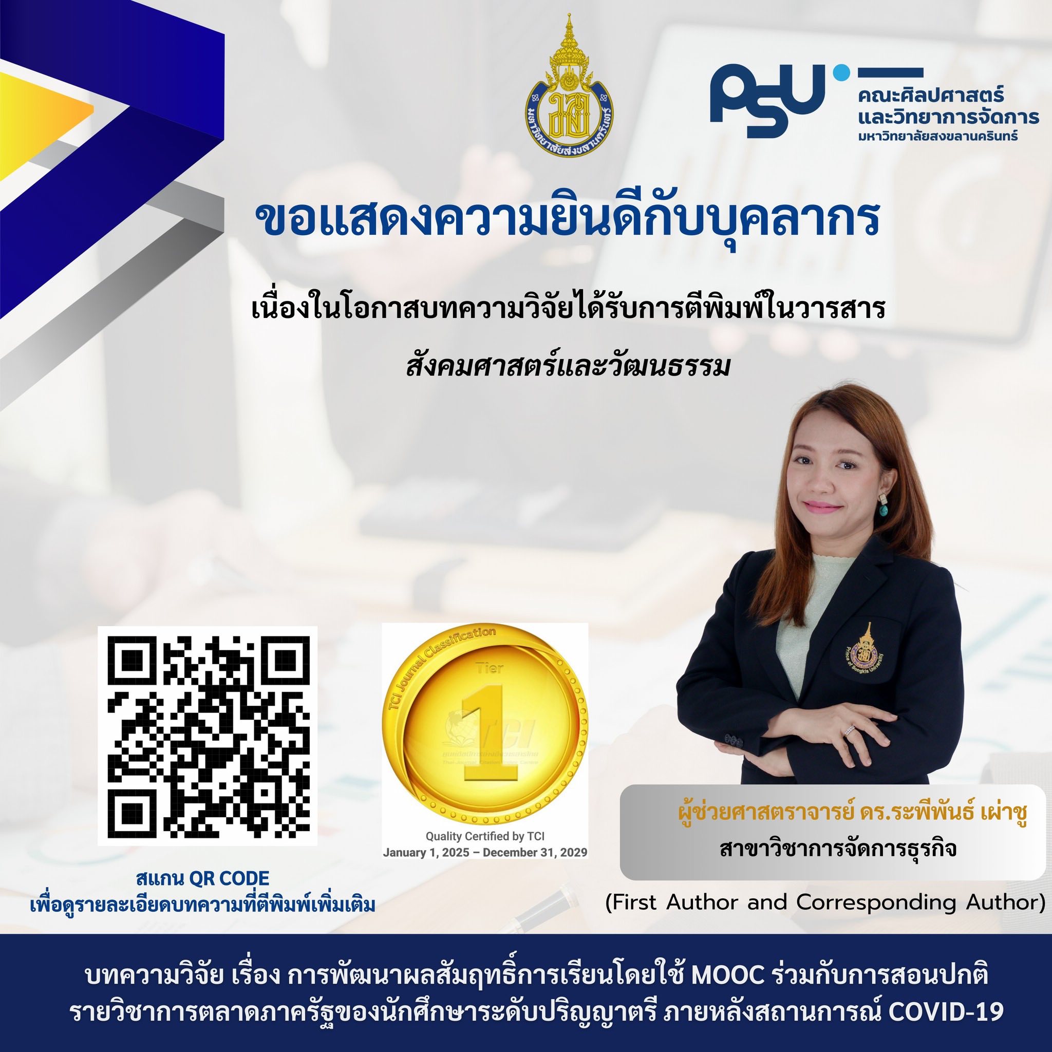 ขอแสดงความยินดีกับคณาจารย์คณะศิลปศาสตร์และวิทยาการจัดการ มหาวิทยาลัยสงขลานครินทร์ วิทยาเขตสุราษฎร์ธานี ในโอกาสที่ผลงานวิจัยได้รับการตีพิมพ์เผยแพร่ ในวารสารวิชาการระดับคุณภาพที่ได้รับการยอมรับ