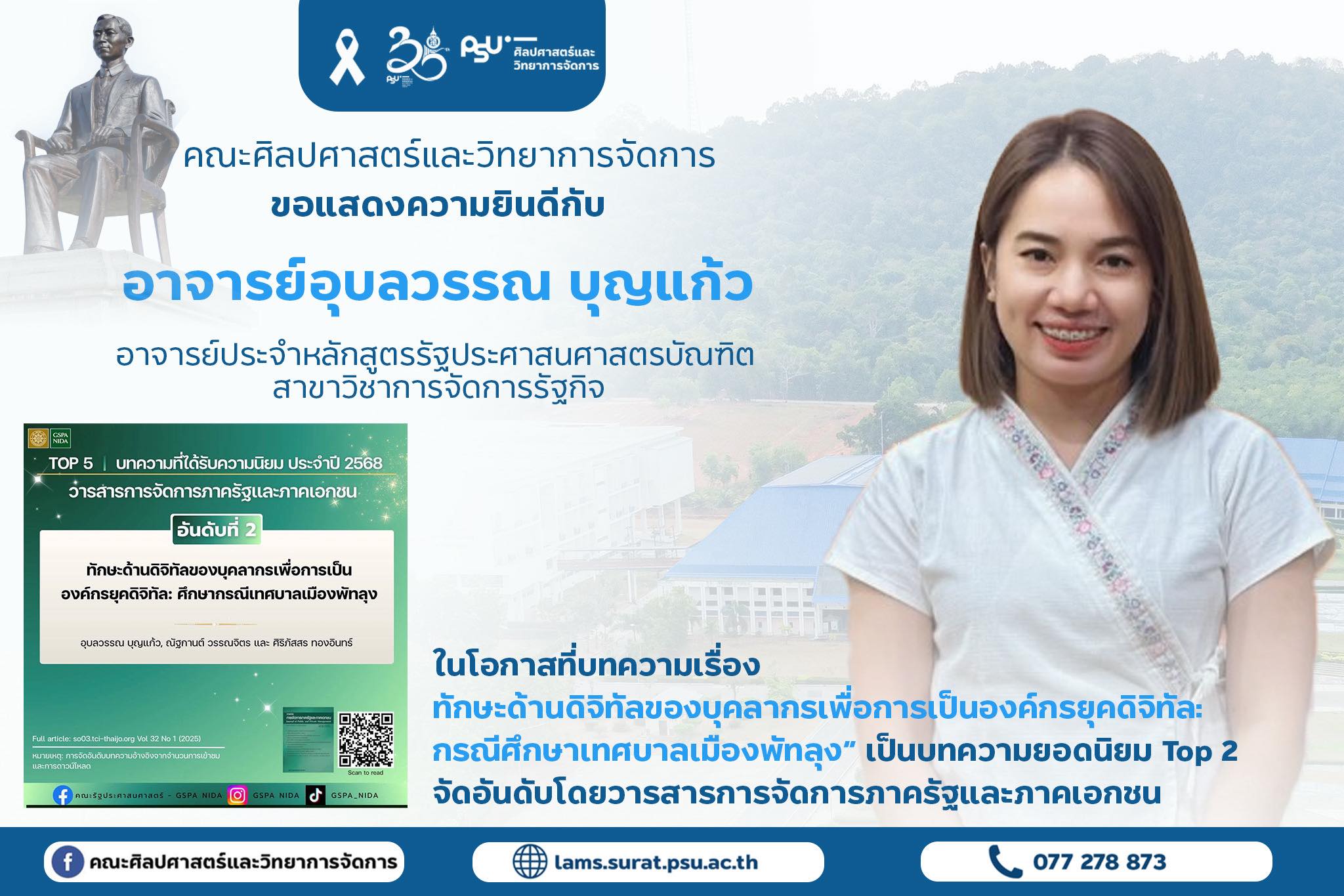 คณะศิลปศาสตร์และวิทยาการจัดการ ขอแสดงความยินดีกับผลงานวิชาการโดดเด่น คณะศิลปศาสตร์และวิทยาการจัดการ ขอแสดงความยินดีกับ อาจารย์อุบลวรรณ บุญแก้ว อาจารย์ประจำหลักสูตรรัฐประศาสนศาสตรบัณฑิต สาขาวิชาการจัดการรัฐกิจ ในโอกาสที่บทความวิชาการเรื่อง “ทักษะด้านดิจิทัลของบุคลากรเพื่อการเป็นองค์กรยุคดิจิทัล: กรณีศึกษาเทศบาลเมืองพัทลุง” ได้รับการจัดอันดับเป็น บทความยอดนิยม (Top 2) จากวารสารการจัดการภาครัฐและภาคเอกชน ประจำปี พ.ศ. 2568 ผลงานดังกล่าวสะท้อนถึงความรู้ ความสามารถ และศักยภาพด้านการวิจัยของอาจารย์ ตลอดจนเป็นการสร้างชื่อเสียงและความภาคภูมิใจให้แก่คณะศิลปศาสตร์และวิทยาการจัดการ และมหาวิทยาลัยอย่างดียิ่ง คณะศิลปศาสตร์และวิทยาการจัดการ ขอร่วมแสดงความชื่นชมและยินดีในความสำเร็จครั้งนี้เป็นอย่างยิ่ง