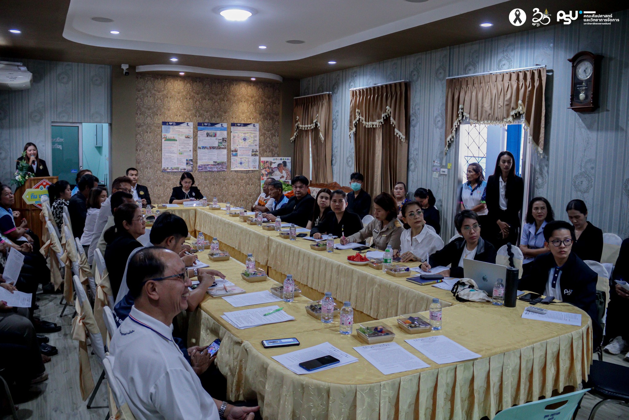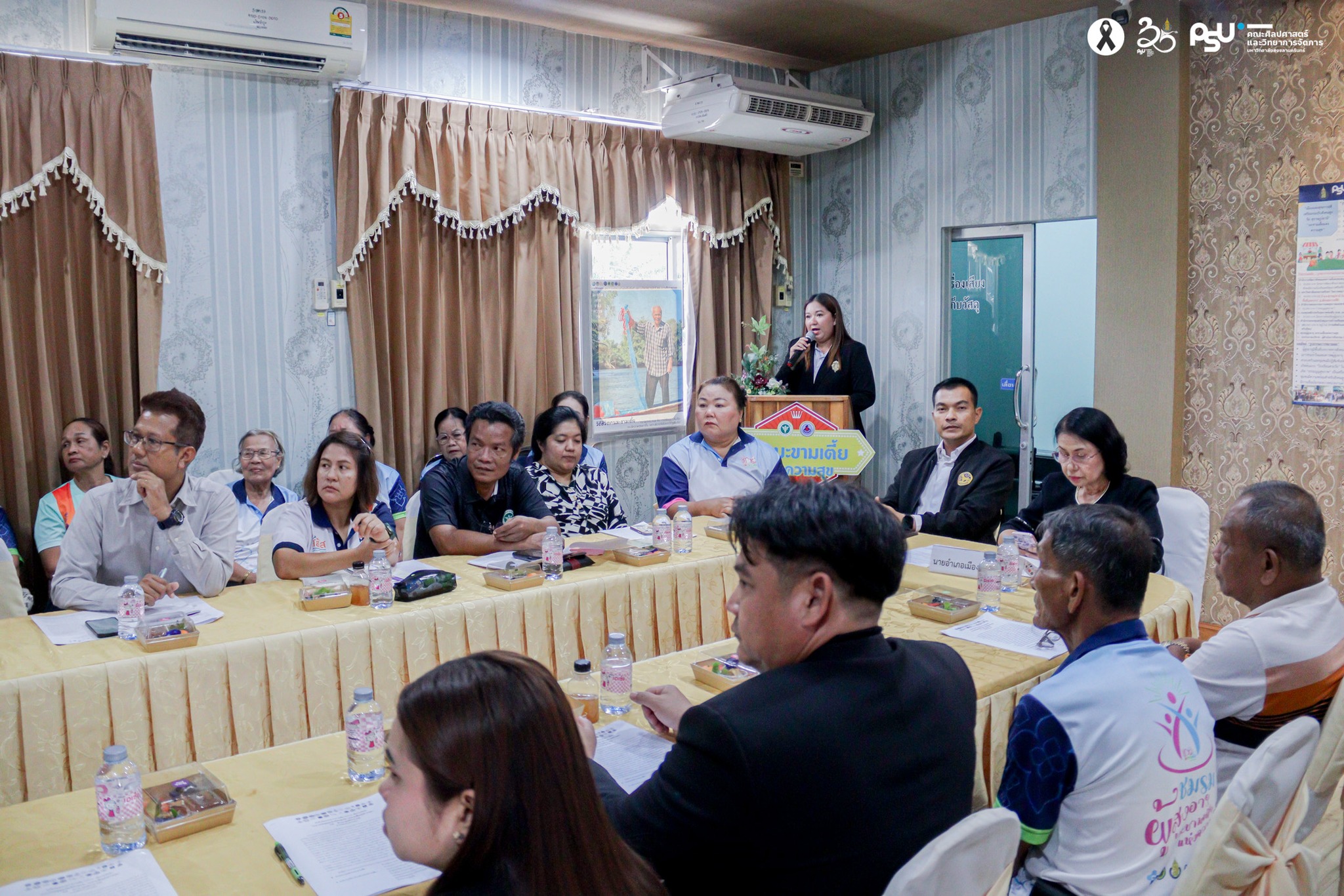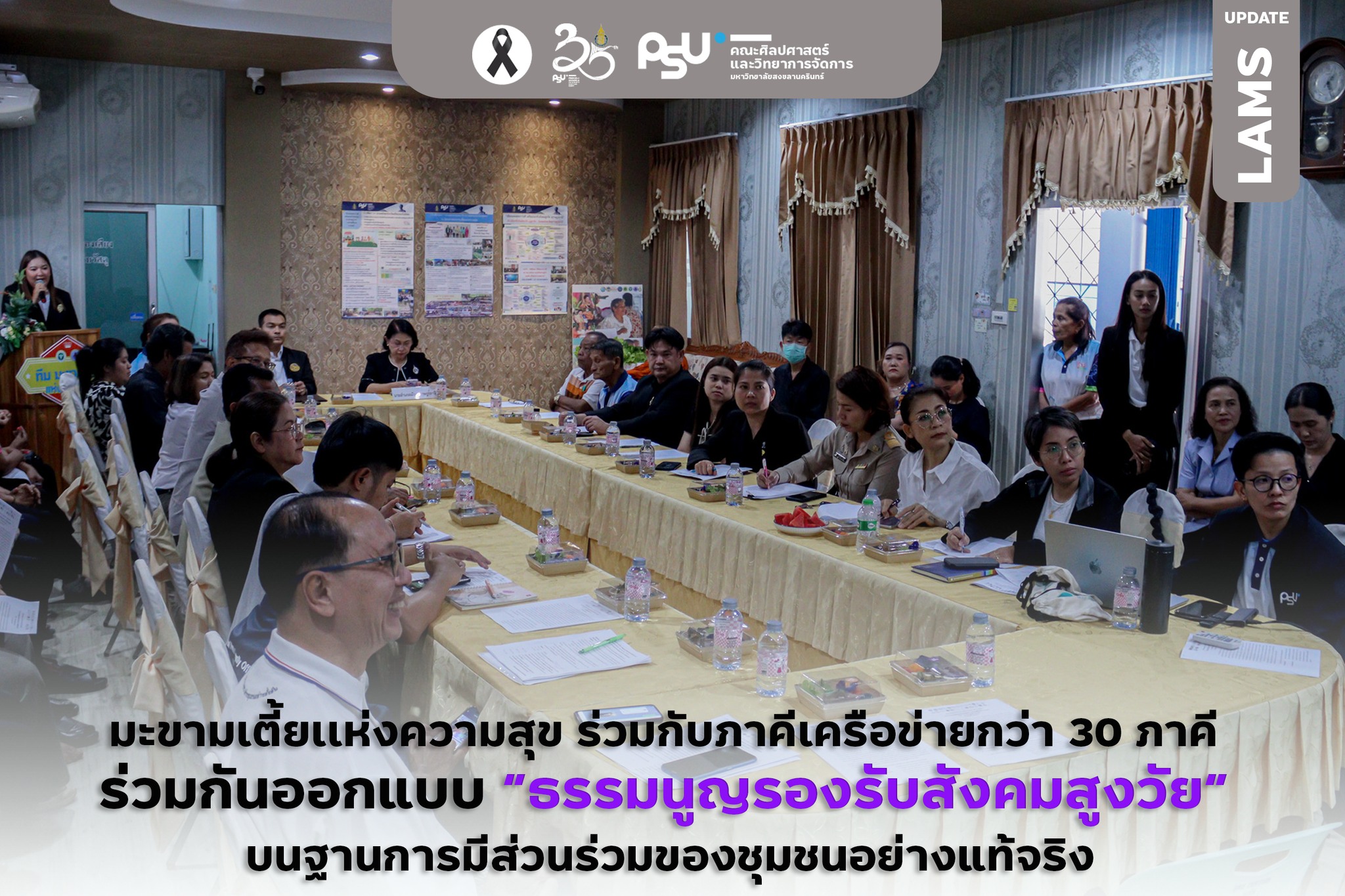 คณะศิลปศาสตร์และวิทยาการจัดการ ร่วมเวทีภาคีเครือข่ายกว่า 30 หน่วยงาน ขับเคลื่อน “มะขามเตี้ยแห่งความสุข” สู่เมืองที่เป็นมิตรกับผู้สูงวัยทั้ง 4 มิติ เมื่อวันที่ 9 กุมภาพันธ์ 2569 คณะศิลปศาสตร์และวิทยาการจัดการ นำโดย ผู้ช่วยศาสตราจารย์ ดร.ศิริพร เพ็งจันทร์ ประธานกรรมการบริหารหลักสูตรวิชารัฐประศาสนศาสตรบัณฑิต สาขาการจัดการรัฐกิจ และอาจารย์สมนึก เลิศแก้ว เข้าร่วมเวทีประชุมภาคีเครือข่าย ภายใต้แนวคิด “เพราะสังคมสูงวัย ไม่ใช่แค่ผู้สูงวัย” ในการประชุมเชิงปฏิบัติการหัวข้อ “หารือธรรมนูญรองรับสังคมสูงวัย มะขามเตี้ยแห่งความสุข” ณ ห้องประชุมโรงพยาบาลส่งเสริมสุขภาพตำบลมะขามเตี้ย อำเภอเมือง จังหวัดสุราษฎร์ธานี ในการนี้ ดร. วิชชุตา มาชู รองคณบดีฝ่ายยุทธศาสตร์และพันธกิจเพื่อสังคม คณะศิลปศาสตร์และวิทยาการจัดการ ได้เข้าร่วมแสดงความยินดีในความสำเร็จในครั้งนี้ด้วย เวทีดังกล่าวจัดขึ้นโดย ชมรมผู้สูงอายุ “มะขามเตี้ยแห่งความสุข” เพื่อเปิดพื้นที่การมีส่วนร่วมของชุมชนและภาคีเครือข่ายในการร่วมออกแบบ “ธรรมนูญรองรับสังคมสูงวัย” บนฐานการมีส่วนร่วมอย่างแท้จริง โดยมีผู้แทนจากหน่วยงานภาครัฐ ภาคการศึกษา ภาคศาสนา ภาคเอกชน องค์กรชุมชน และภาคีเครือข่ายกว่า 30 หน่วยงาน เข้าร่วมแลกเปลี่ยนความคิดเห็นอย่างกว้างขวาง นอกจากนี้ คณะศิลปศาสตร์และวิทยาการจัดการ ได้เข้าร่วมในฐานะภาคีทางวิชาการ โดยมี รองคณบดีฝ่ายพันธกิจสังคมและยุทธศาสตร์องค์กร พร้อมด้วยเครือข่ายทางวิชาการร่วมแลกเปลี่ยนองค์ความรู้ แนวคิด และข้อเสนอเชิงนโยบาย เพื่อสนับสนุนการพัฒนาพื้นที่ต้นแบบสังคมสูงวัยอย่างรอบด้าน การประชุมครั้งนี้ถือเป็นเวทีสำคัญในการกำหนดทิศทางและ “หมุดหมายการขับเคลื่อน” สู่การเป็นเมืองที่เป็นมิตรกับผู้สูงวัย โดยบูรณาการการทำงานร่วมกันใน 4 มิติหลัก ได้แก่