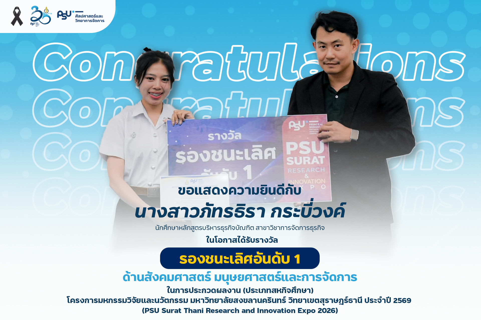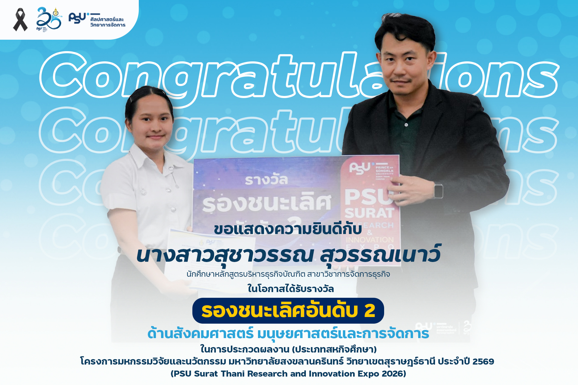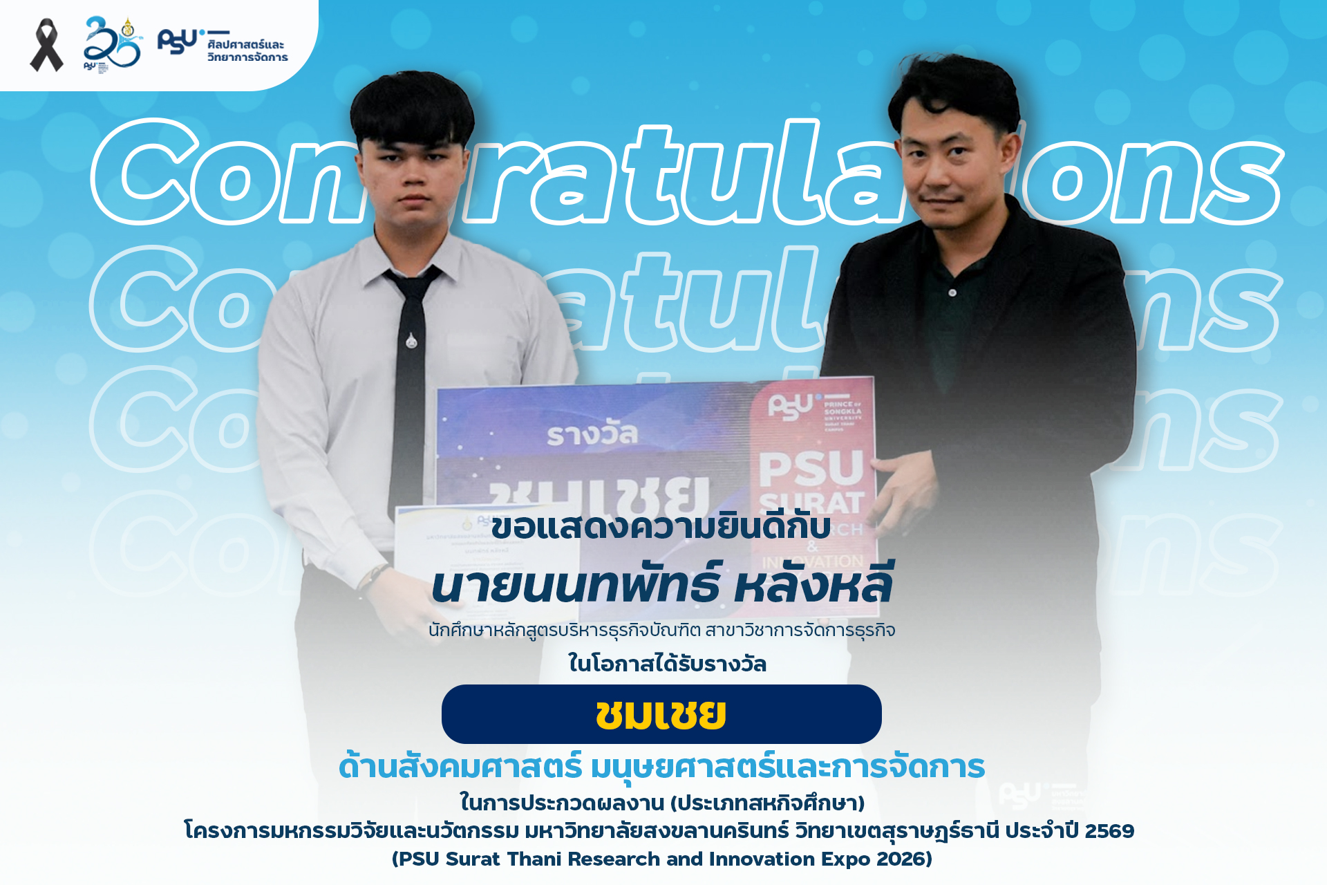 คณะศิลปศาสตร์และวิทยาการจัดการ มหาวิทยาลัยสงขลานครินทร์ วิทยาเขตสุราษฎร์ธานี ขอแสดงความยินดีกับนักศึกษาที่ได้รับรางวัลจากการประกวดผลงาน (ประเภทสหกิจศึกษา) ในงาน PSU Surat Thani Research and Innovation Expo 2026