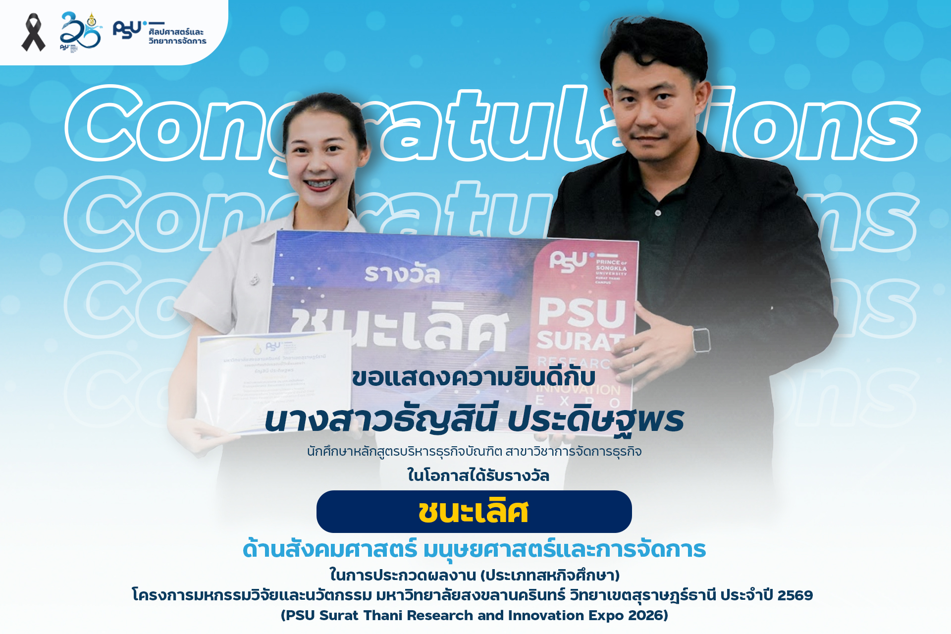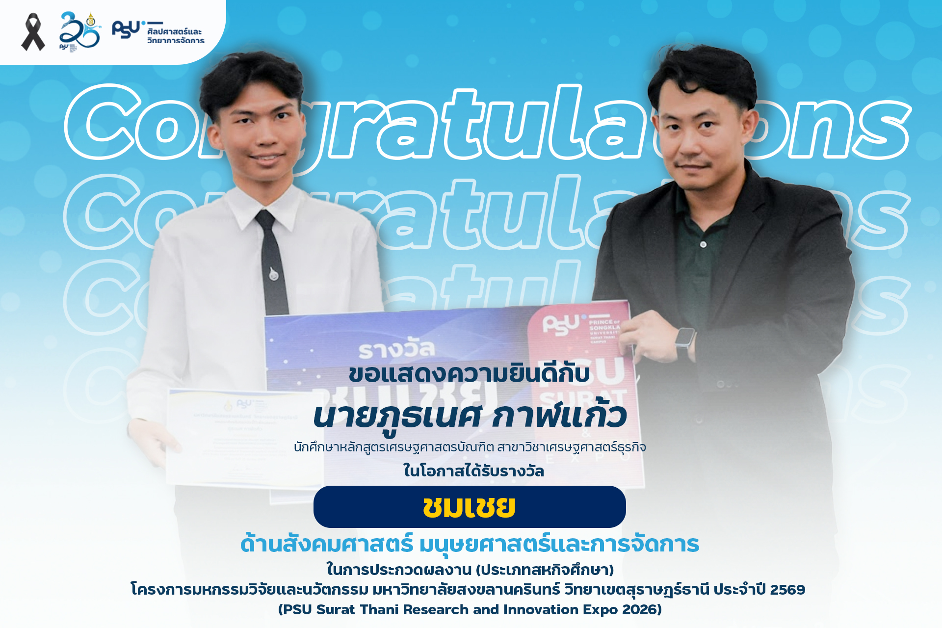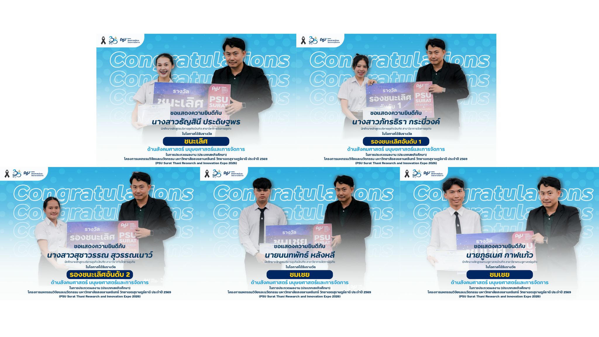 คณะศิลปศาสตร์และวิทยาการจัดการ มหาวิทยาลัยสงขลานครินทร์ วิทยาเขตสุราษฎร์ธานี ขอแสดงความยินดีกับนักศึกษาที่ได้รับรางวัลจากการประกวดผลงาน (ประเภทสหกิจศึกษา) ในงาน PSU Surat Thani Research and Innovation Expo 2026